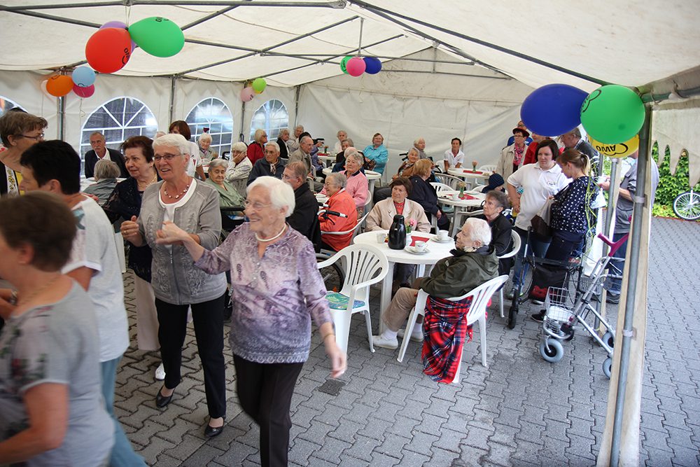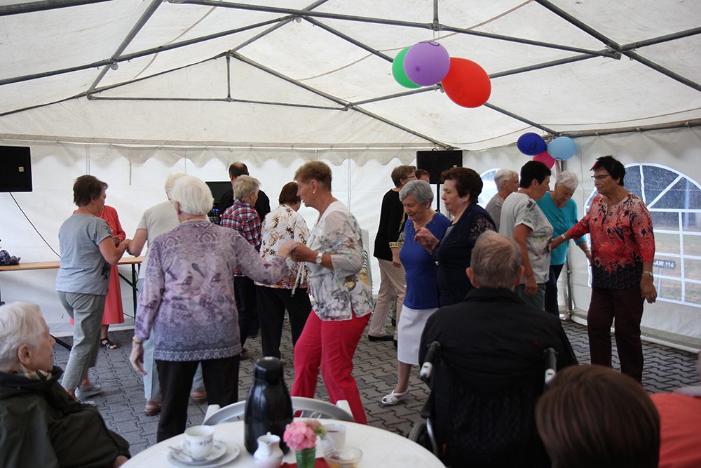 Der Nachmittag stand ganz im Zeichen eines Senioren- und Familienfestes. Neben Kaffee und Kuchen war die Seniorentanzgruppe mit Freude im Einsatz. Das Spielmobil des Kreissportbundes und das Kinderschminken wurde rege genutzt. Ein Beratungsstand des Vitakt Hausnotrufes, die Apotheke Wasserberg und auch Studenten der TU Bergakademie Freiberg vom Verein „Enactus“ waren vor Ort, um ihre Angebote zu präsentieren. Sogar die Hunde Olli und Tasso ließen es sich nicht nehmen, einen Besuch bei den ihnen vertrauten Menschen abzustatten.