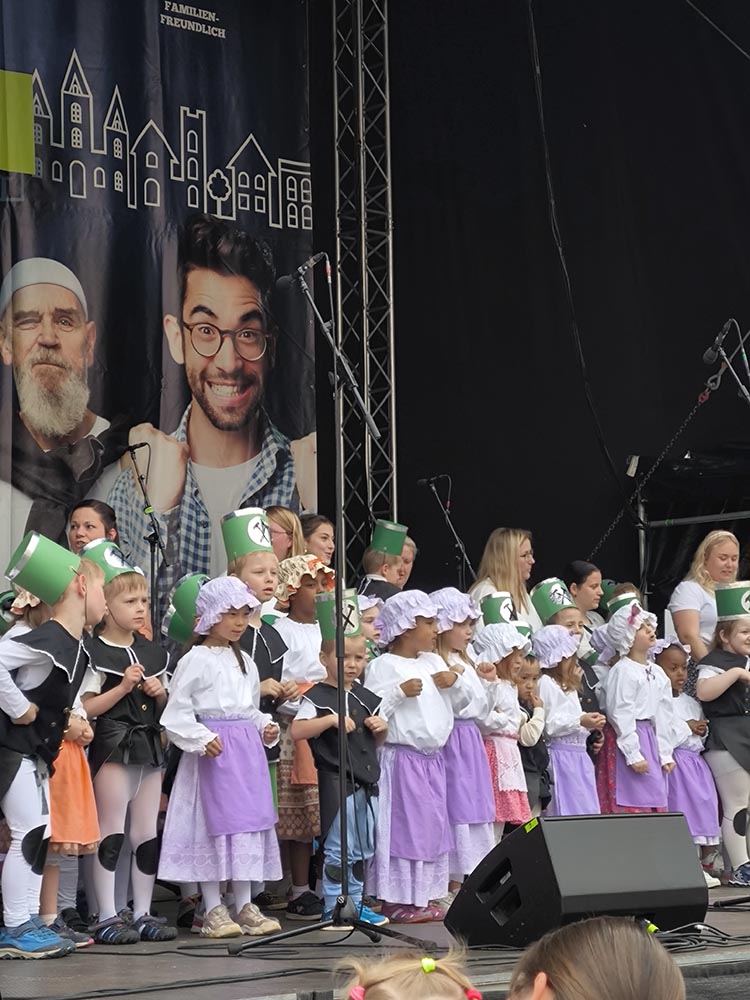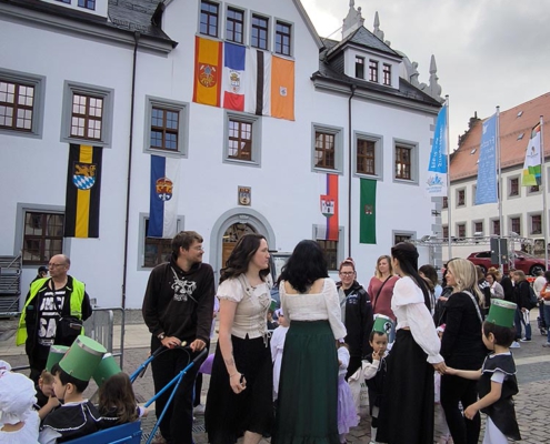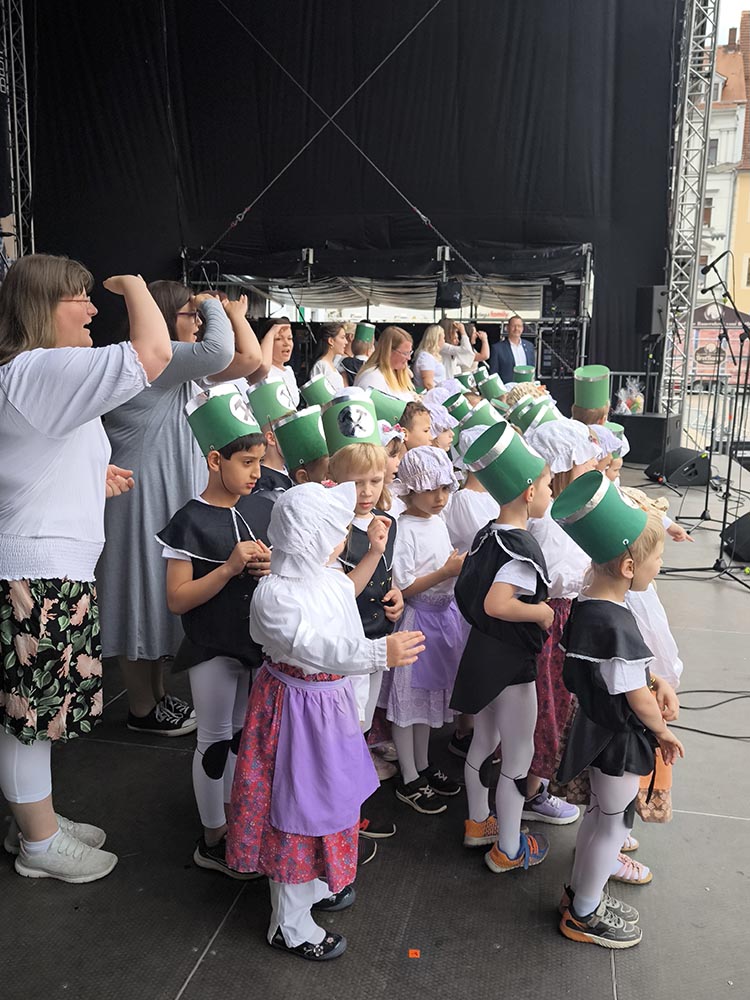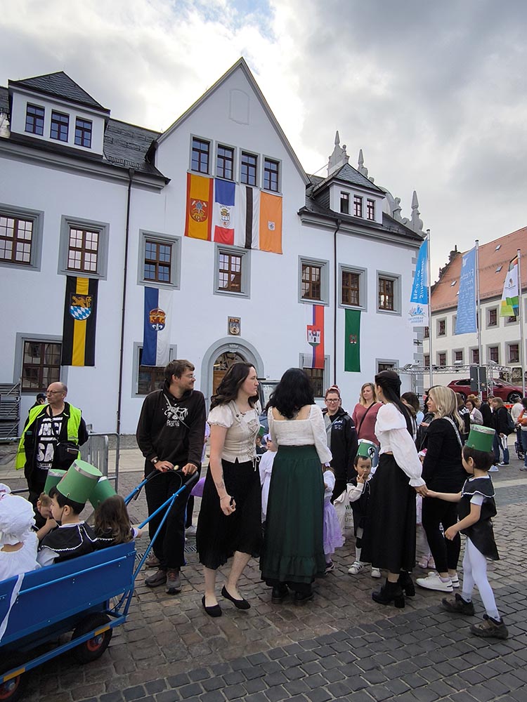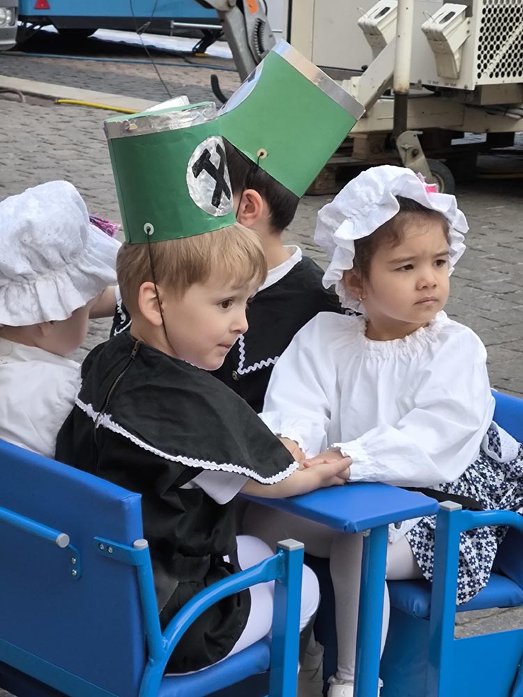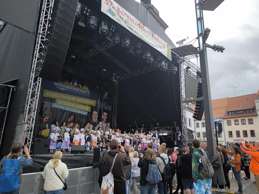 Unsere Freiberger Bergstadtzwerge aus der Schillerstraße durften auch dieses Jahr das Freiberger Bergstadtfest auf der Hauptbühne am Obermarkt eröffnen. Das Steigerlied singend, liefen die kleinen Bergmänner und Mägde am Vormittag in ihren tollen Kostümen zum Rathaus, wo Oberbürgermeister Sven Krüger auf uns wartete.