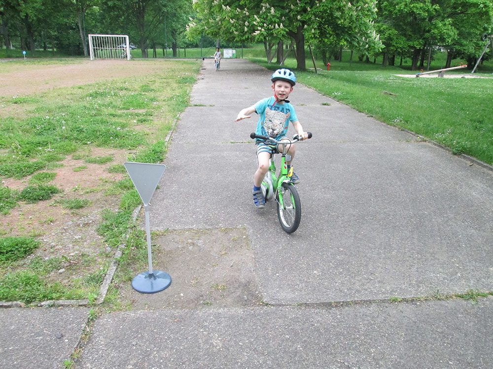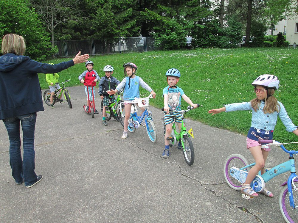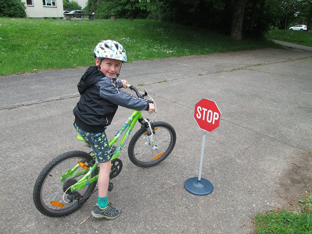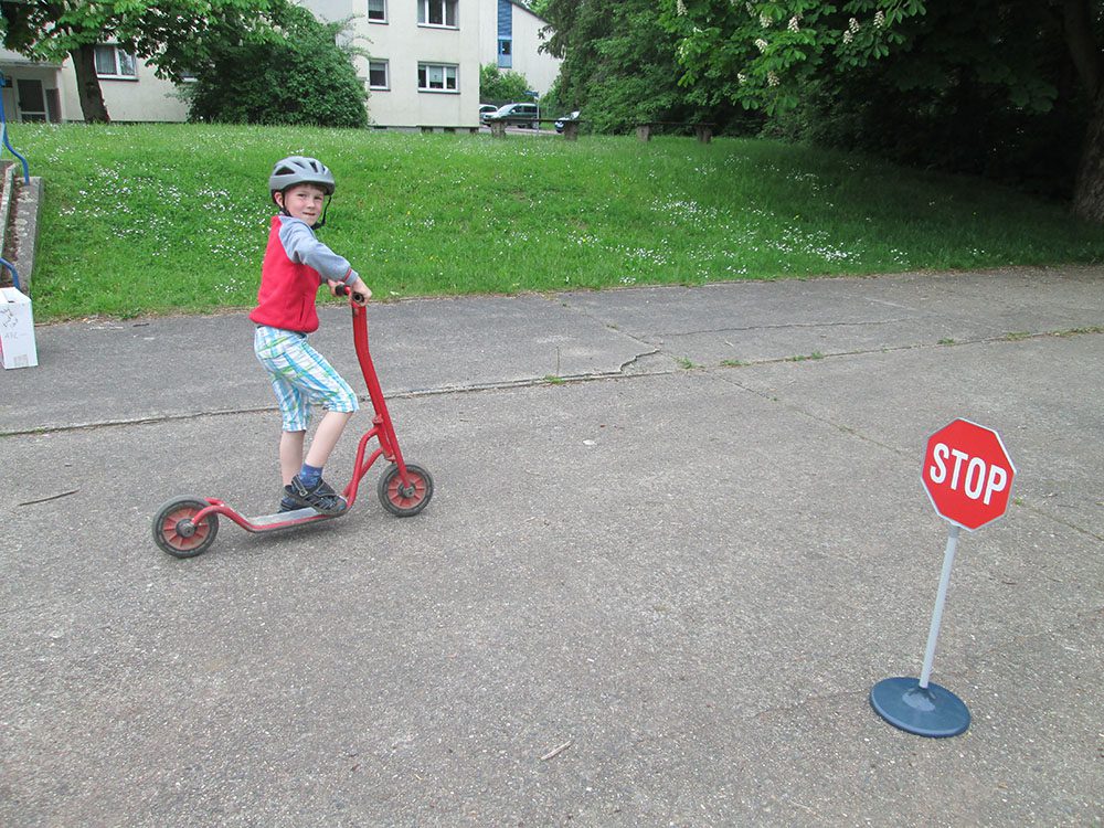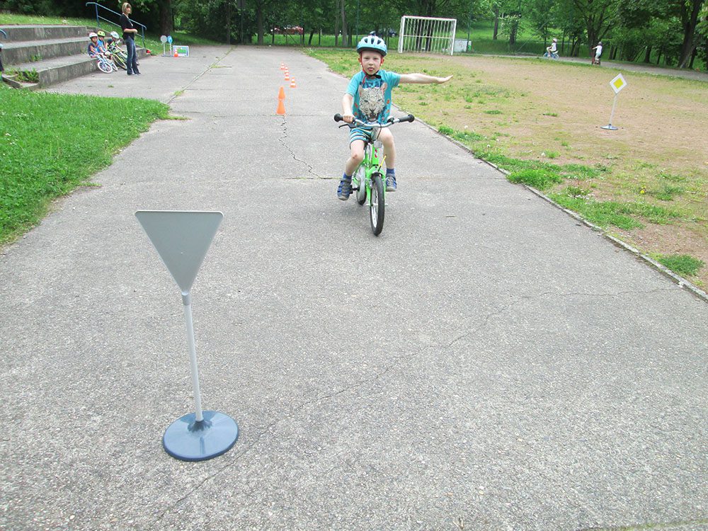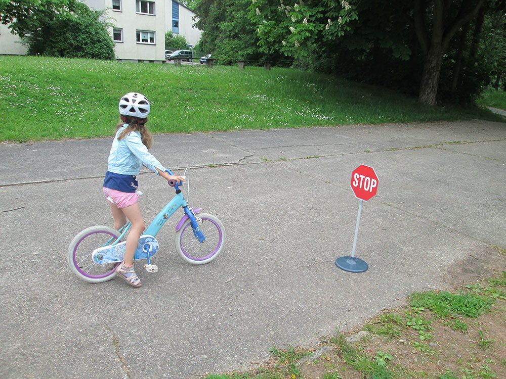 Am STOP-Schild anzuhalten, einen Fuß auf die Straße zu setzen und nach links und rechts zu schauen waren genauso Bestandteil der Übungen, wie das Hand-Heraushalten mit Schulterblick, welches beim Abbiegen von Wichtigkeit ist.