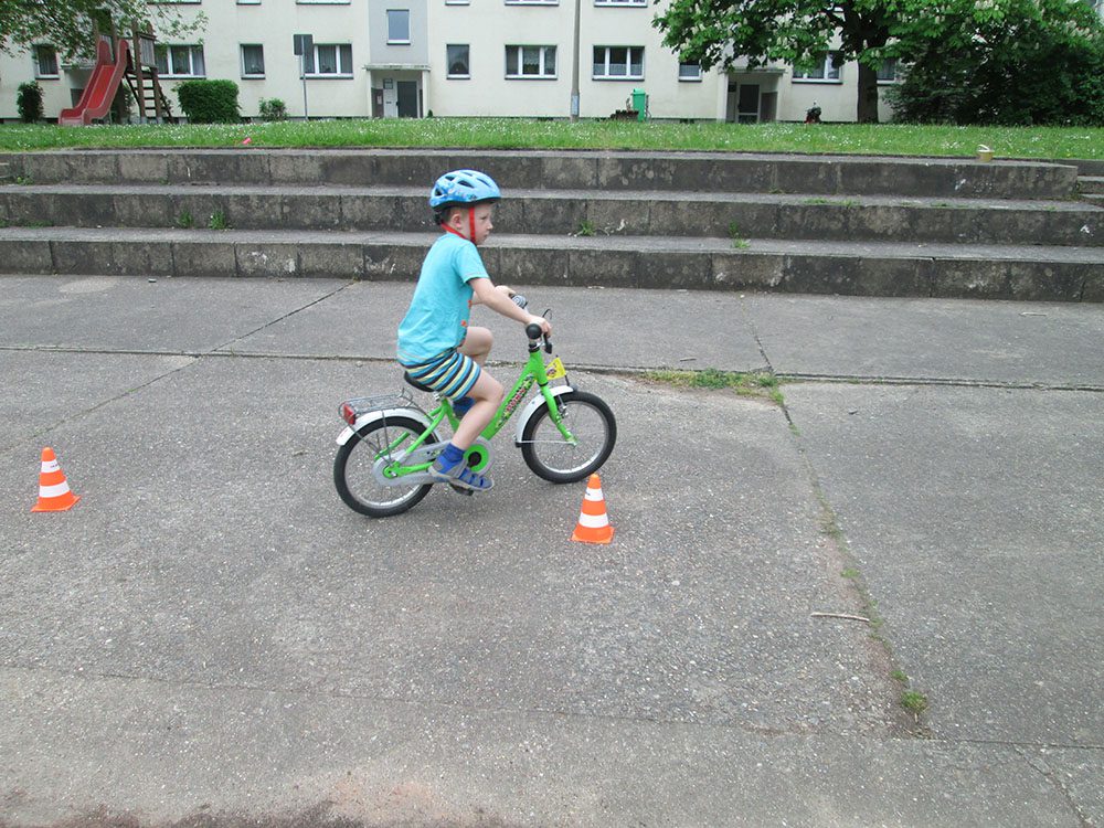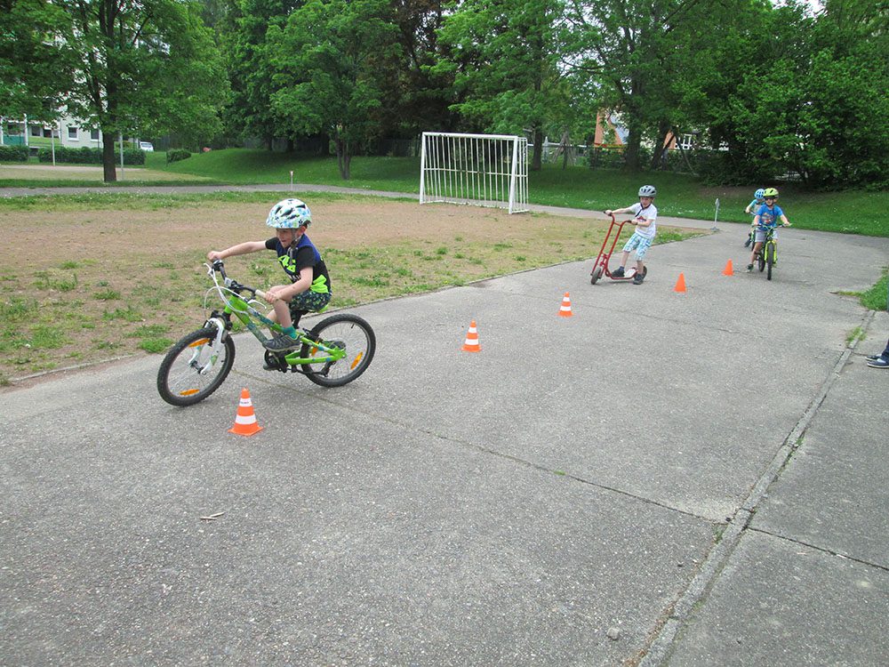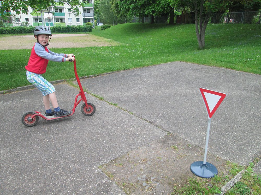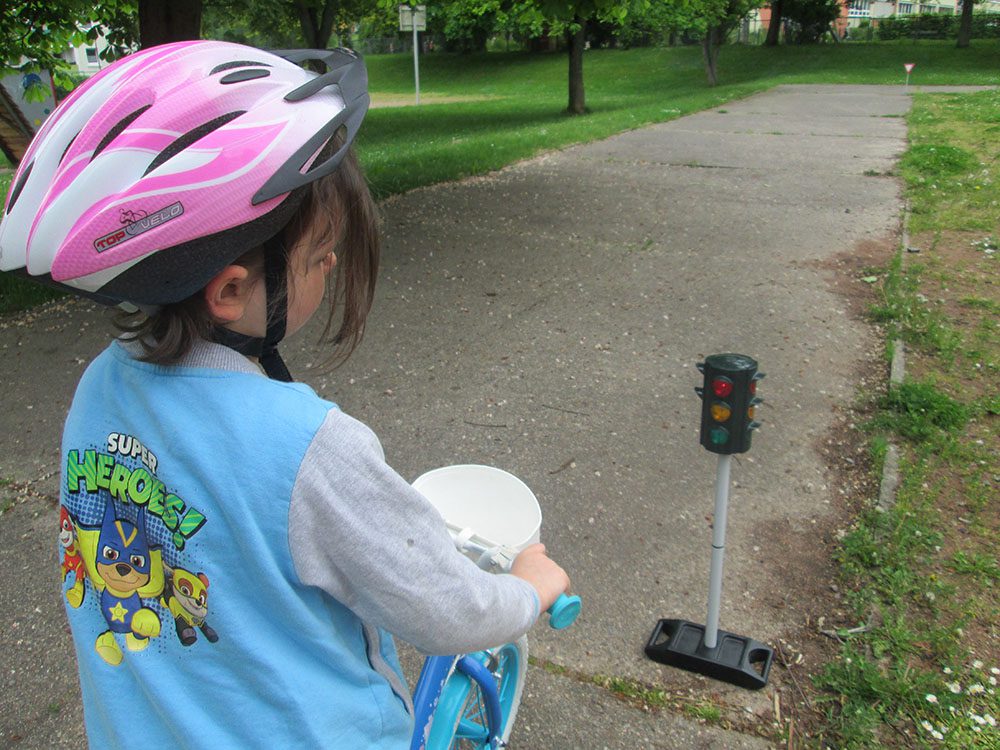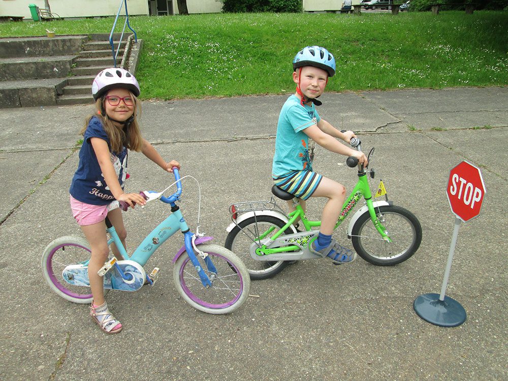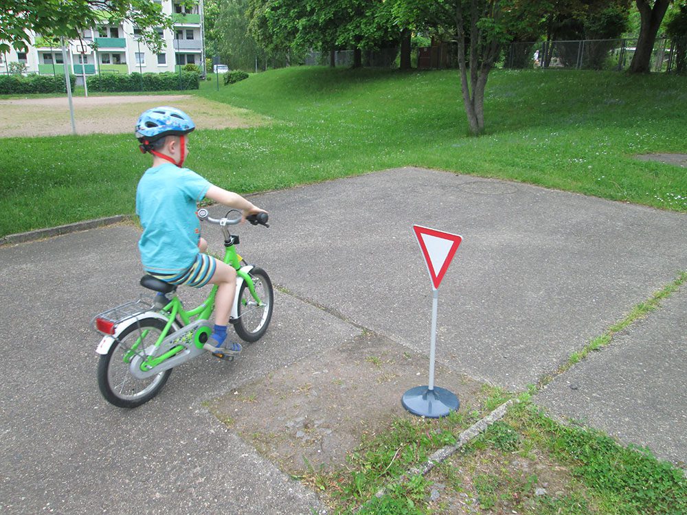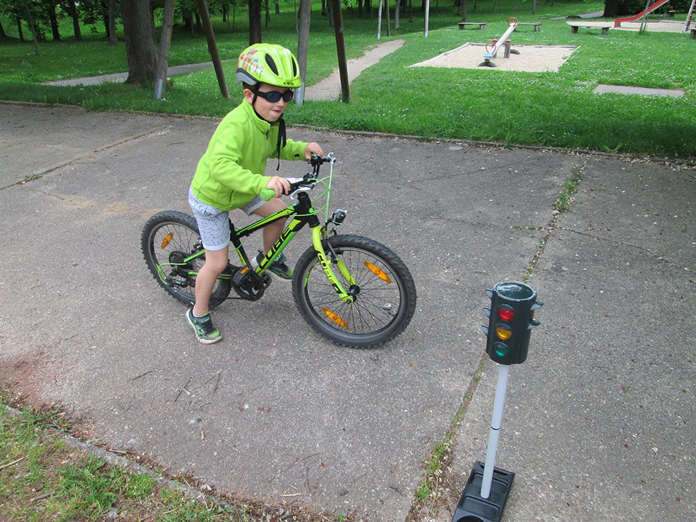 Am STOP-Schild anzuhalten, einen Fuß auf die Straße zu setzen und nach links und rechts zu schauen waren genauso Bestandteil der Übungen, wie das Hand-Heraushalten mit Schulterblick, welches beim Abbiegen von Wichtigkeit ist.