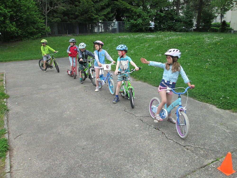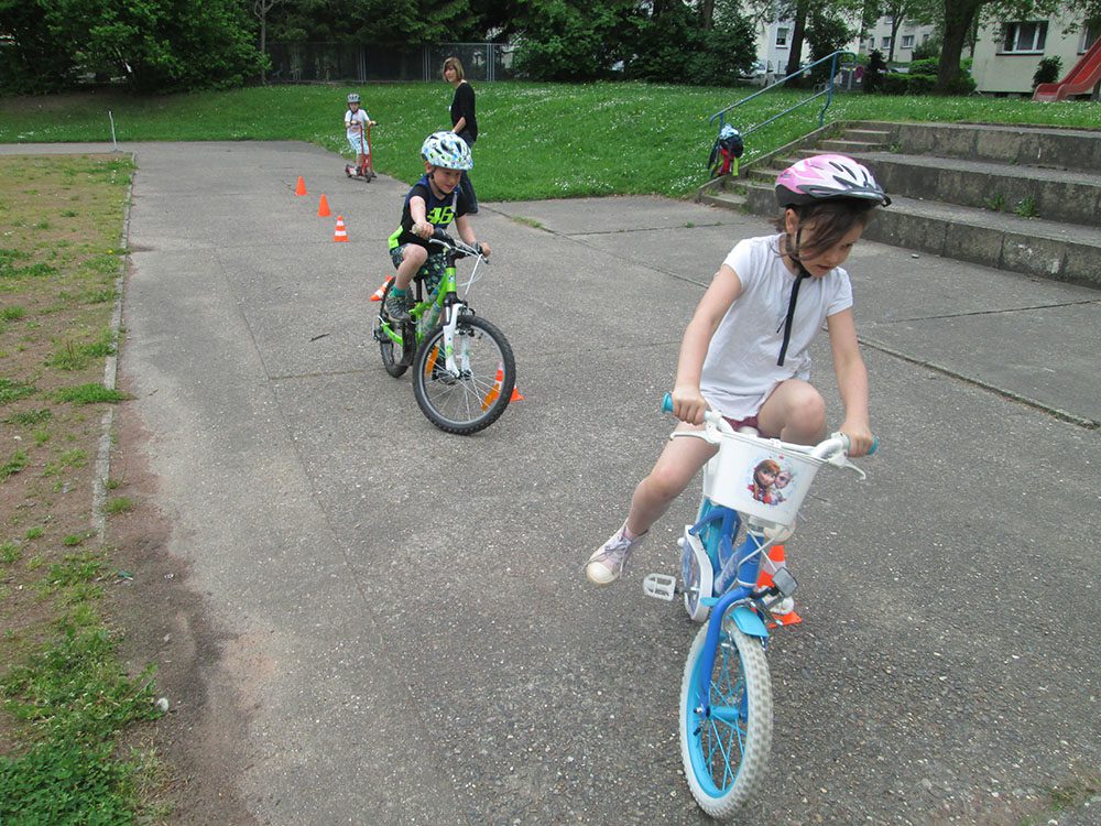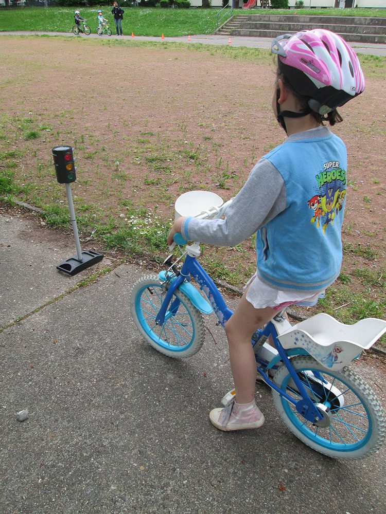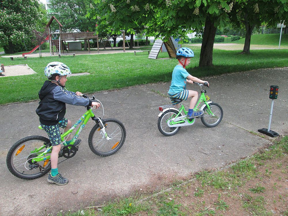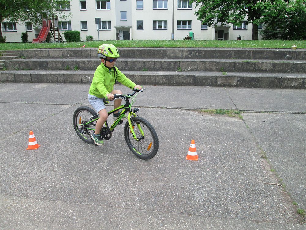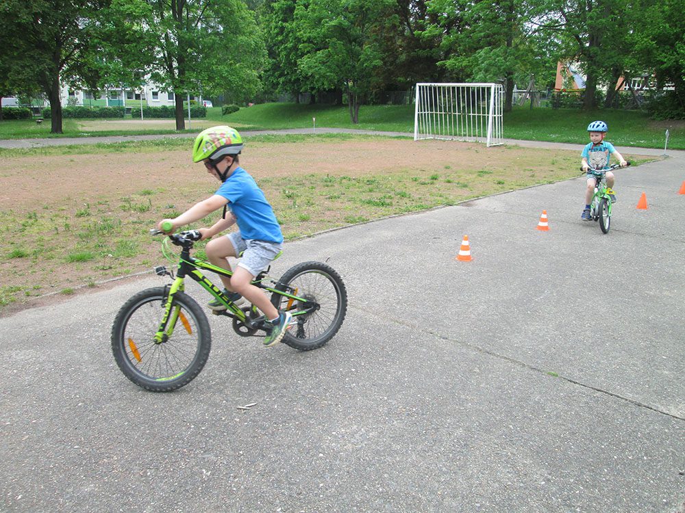 Am STOP-Schild anzuhalten, einen Fuß auf die Straße zu setzen und nach links und rechts zu schauen waren genauso Bestandteil der Übungen, wie das Hand-Heraushalten mit Schulterblick, welches beim Abbiegen von Wichtigkeit ist.