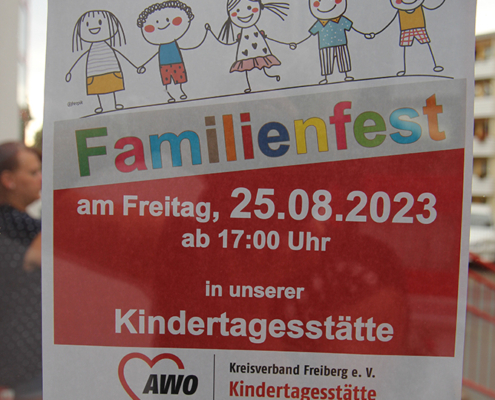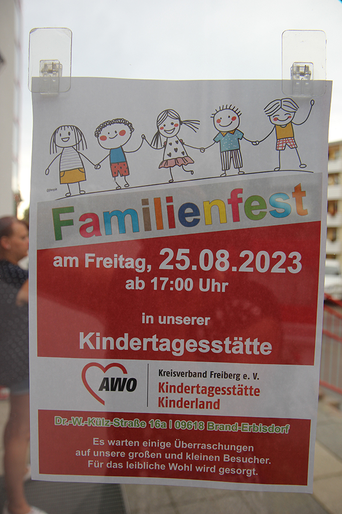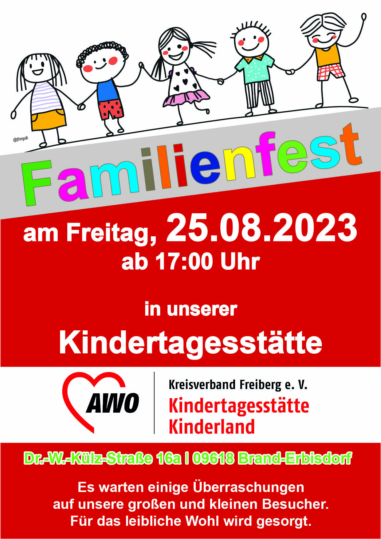 Wir laden herzlich zu unserem Familienfest am 25.08.2023 ab 17:00Uhr in unsere Kita „Kinderland“ auf der Dr. -W.-Külz-Straße 16a in Brand-Erbisdorf ein. Seit 56 Jahren gehören wir zum festen Bestandteil von Brand -Erbisdorf – und leben jeden Tag aufs neue für unsere Kinder und Familien. Diesen Zusammenhalt möchten wir feiern. Neben vielen Programmpunkten, wie einer Hüpfburg, einer Tombola und Kinderschminken durch MitarbeiterInnen vom JUFZ, wird es eine Kletterwand geben, an welcher sich alle Klettermeister austesten können. Für das leibliche Wohl wird gesorgt.