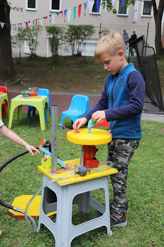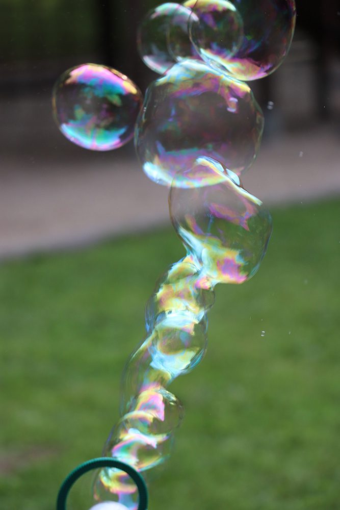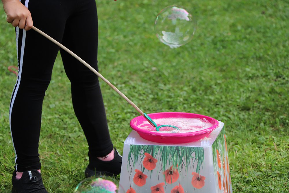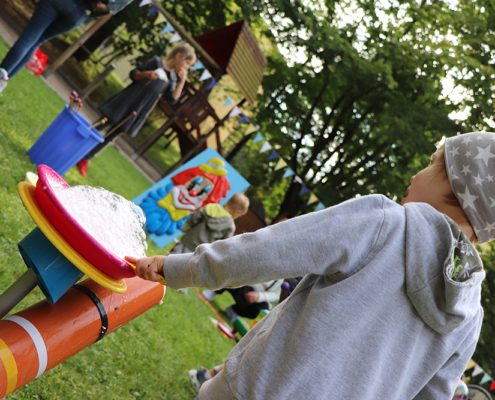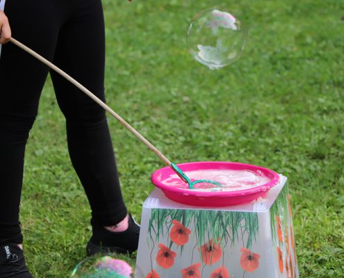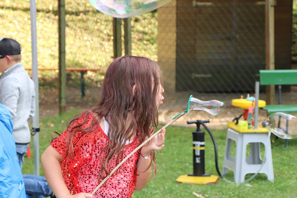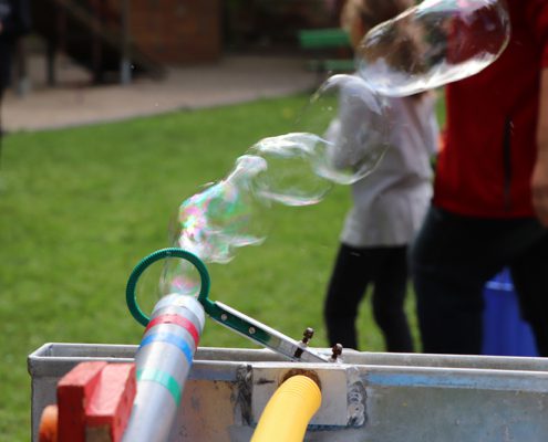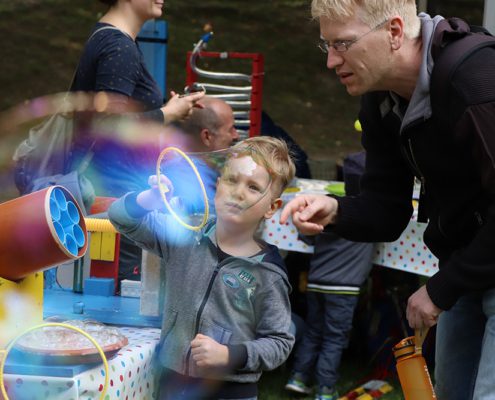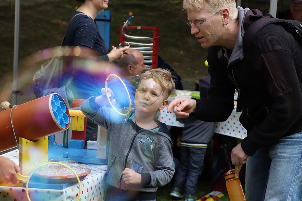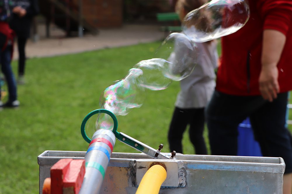 Sehr beliebt waren auch die verschiedenen Kreativangebote im Garten des Kinderlandes. Dass man Seifenblasen nicht nur mit dem Mund machen kann, zeigten die faszinierenden Seifenblasenmaschinen. Wir staunten ebenso über die physikalischen Experimente mit Luft und elektrischen Zeichengeräten.