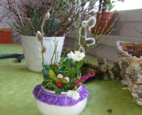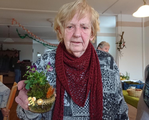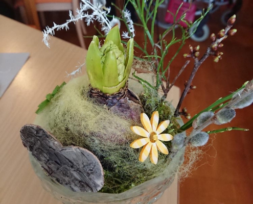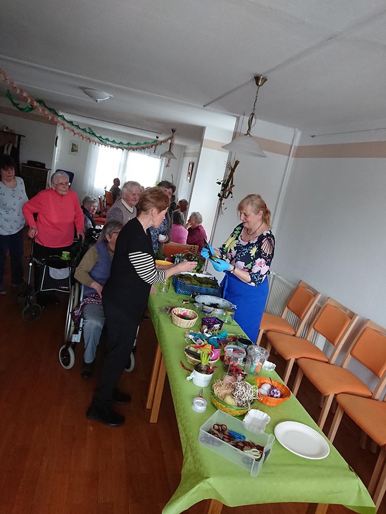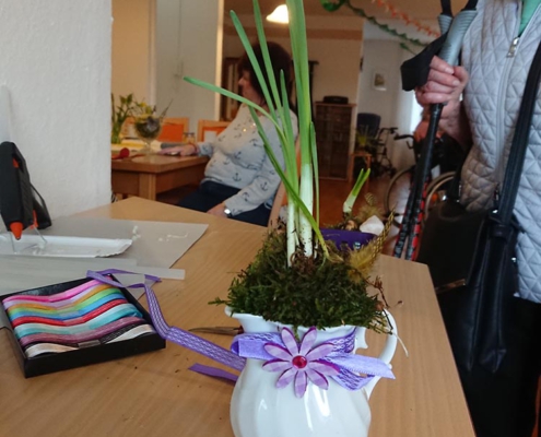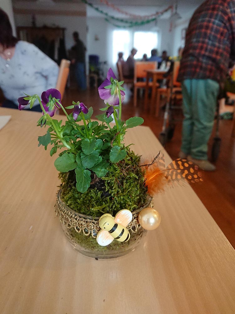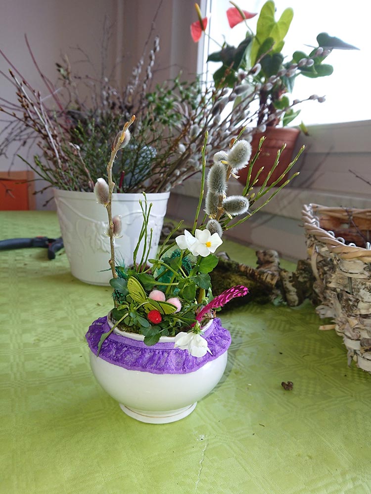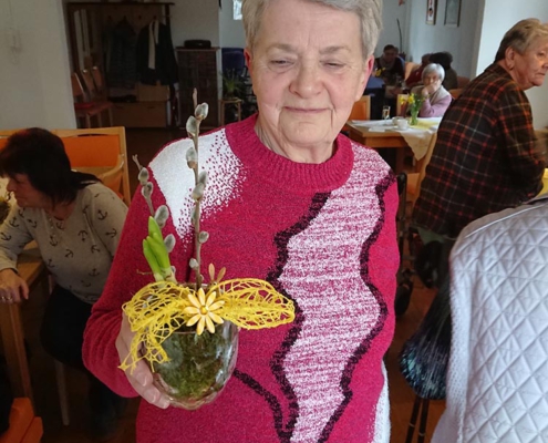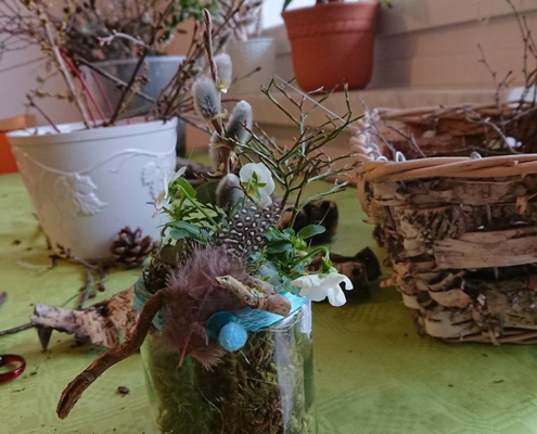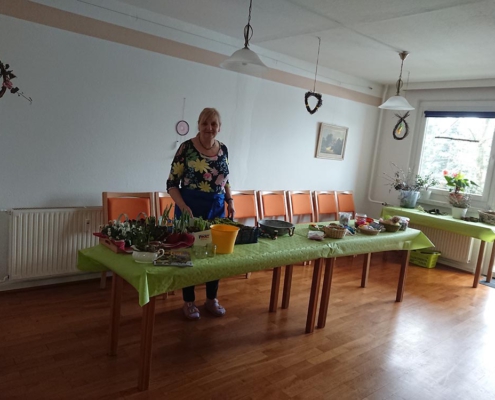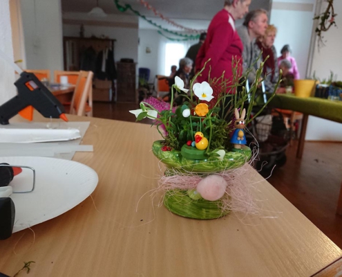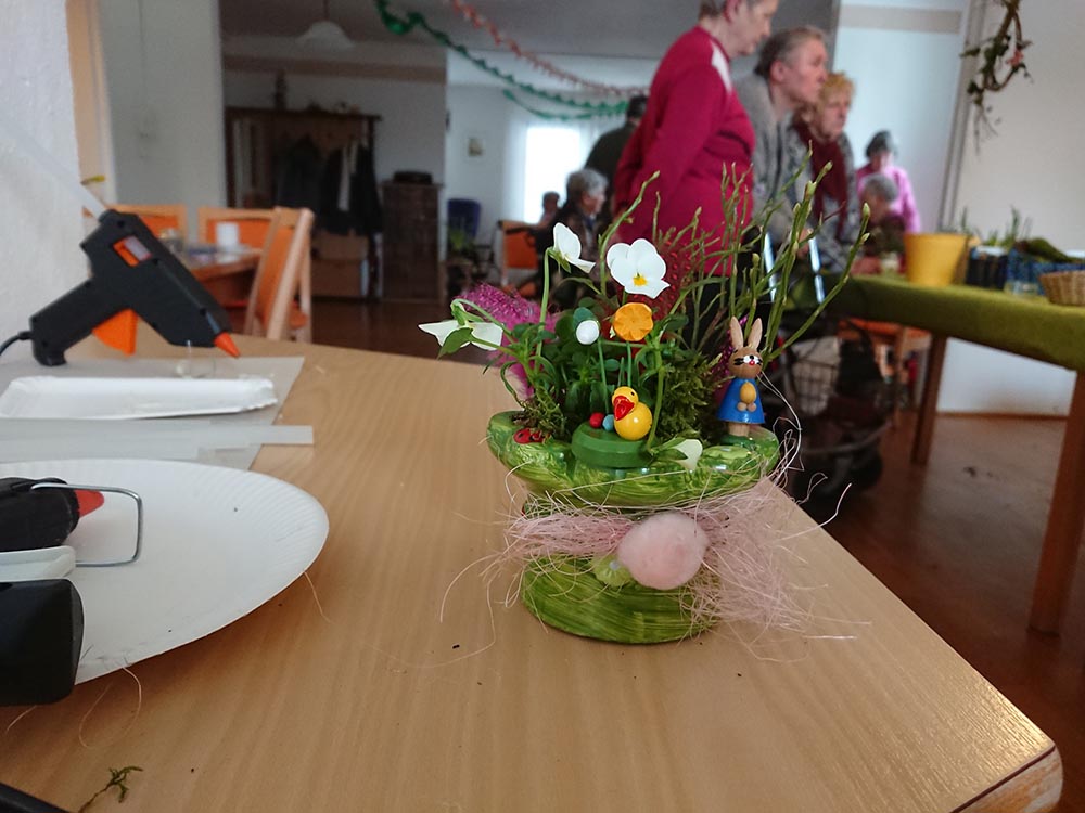 Im Anschluss wurde zum Gestalten eines bunten Frühlingsgesteckes geladen, wozu wir eine bunte Floristikecke aufgebaut hatten, wo sich die Damen ihre selbst mitgebrachten Gefäße mit Blumen bepflanzen und dekorieren konnten. So sind zahlreiche blühende Kunstwerke entstanden.