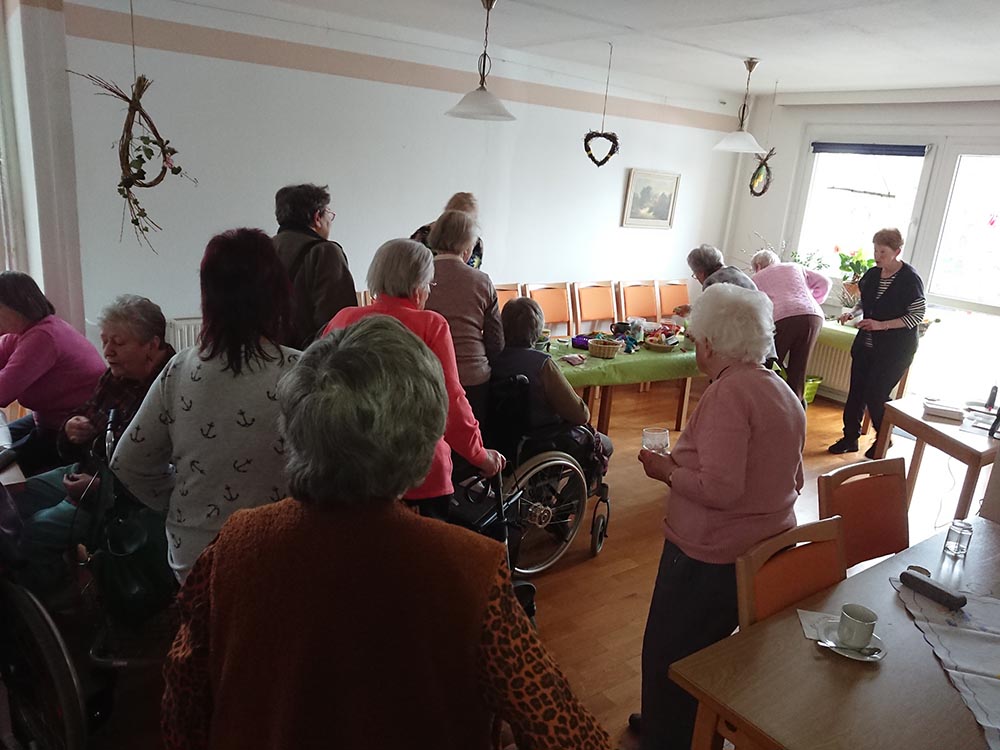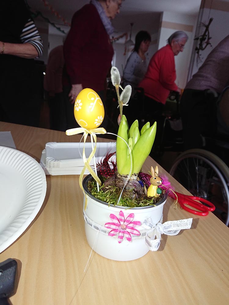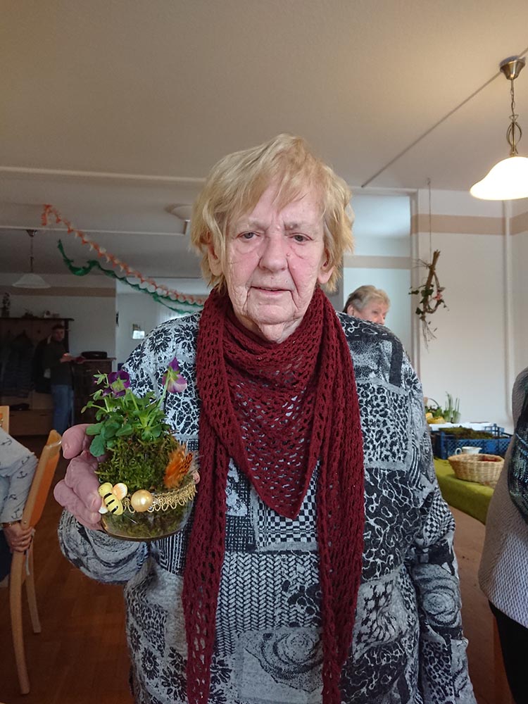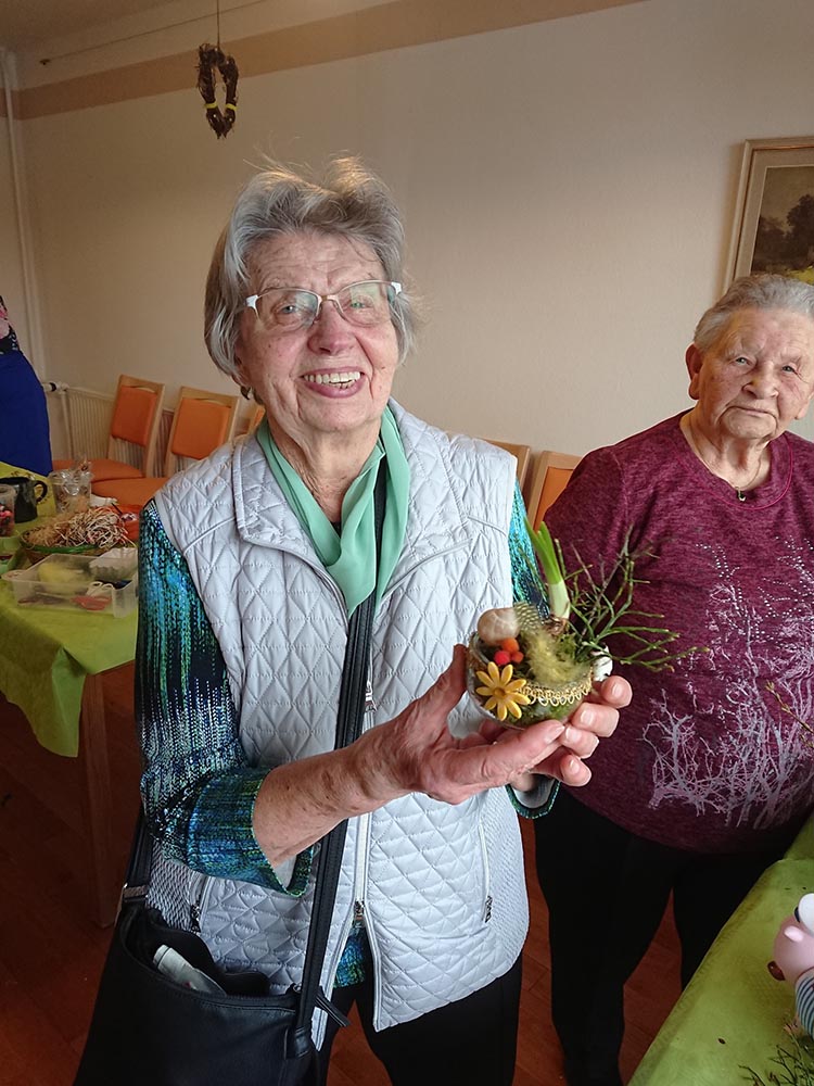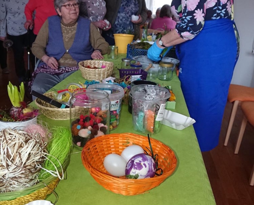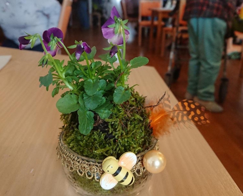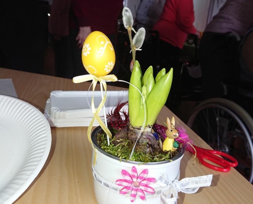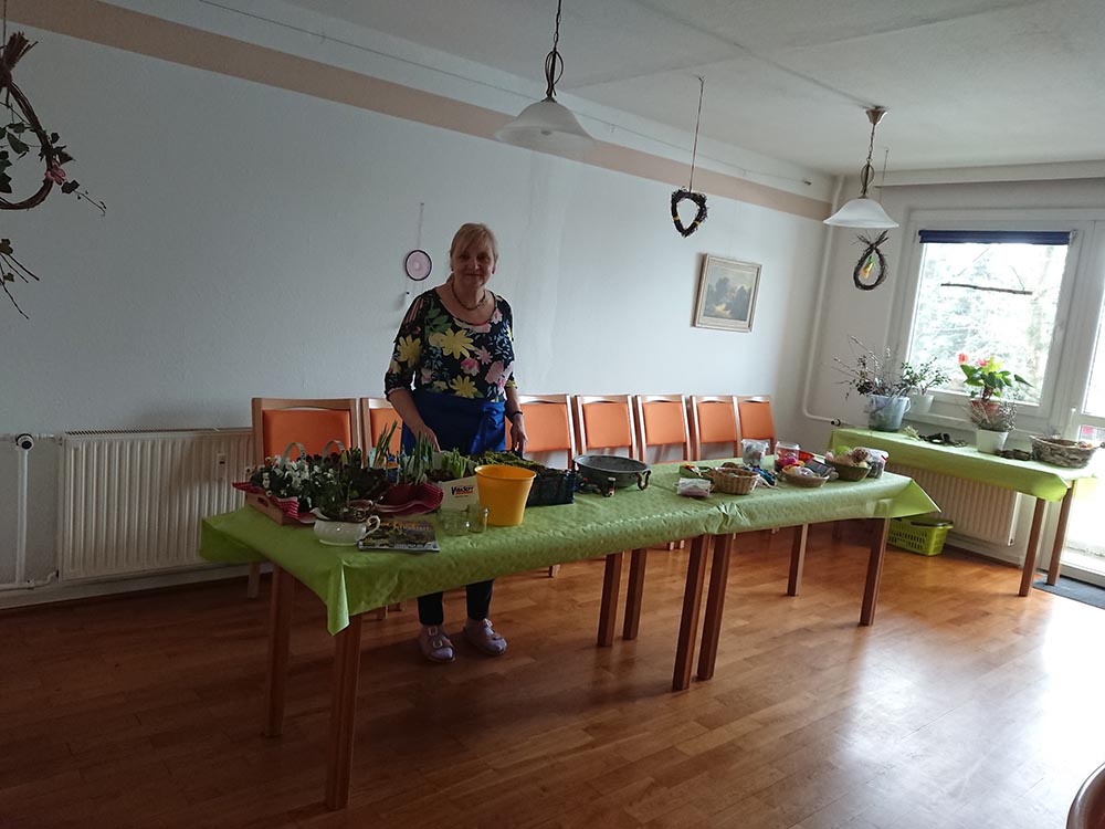 Im Anschluss wurde zum Gestalten eines bunten Frühlingsgesteckes geladen, wozu wir eine bunte Floristikecke aufgebaut hatten, wo sich die Damen ihre selbst mitgebrachten Gefäße mit Blumen bepflanzen und dekorieren konnten. So sind zahlreiche blühende Kunstwerke entstanden.