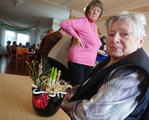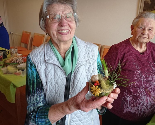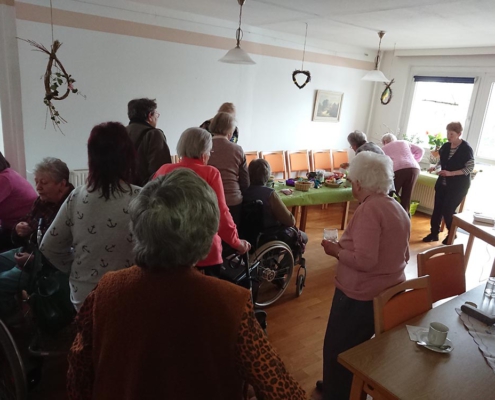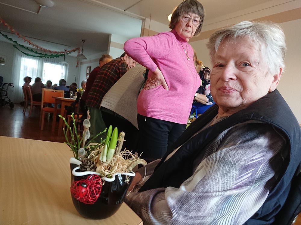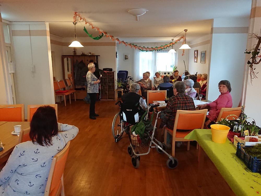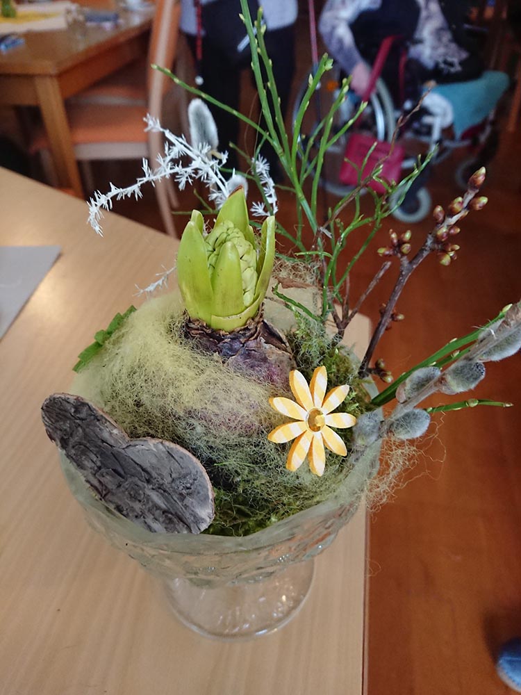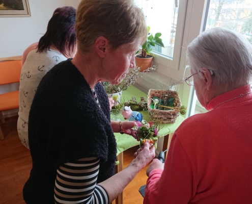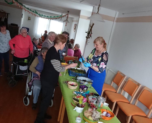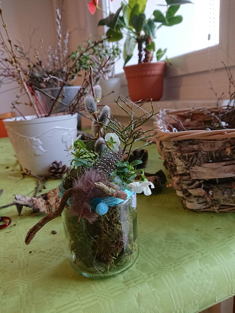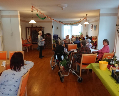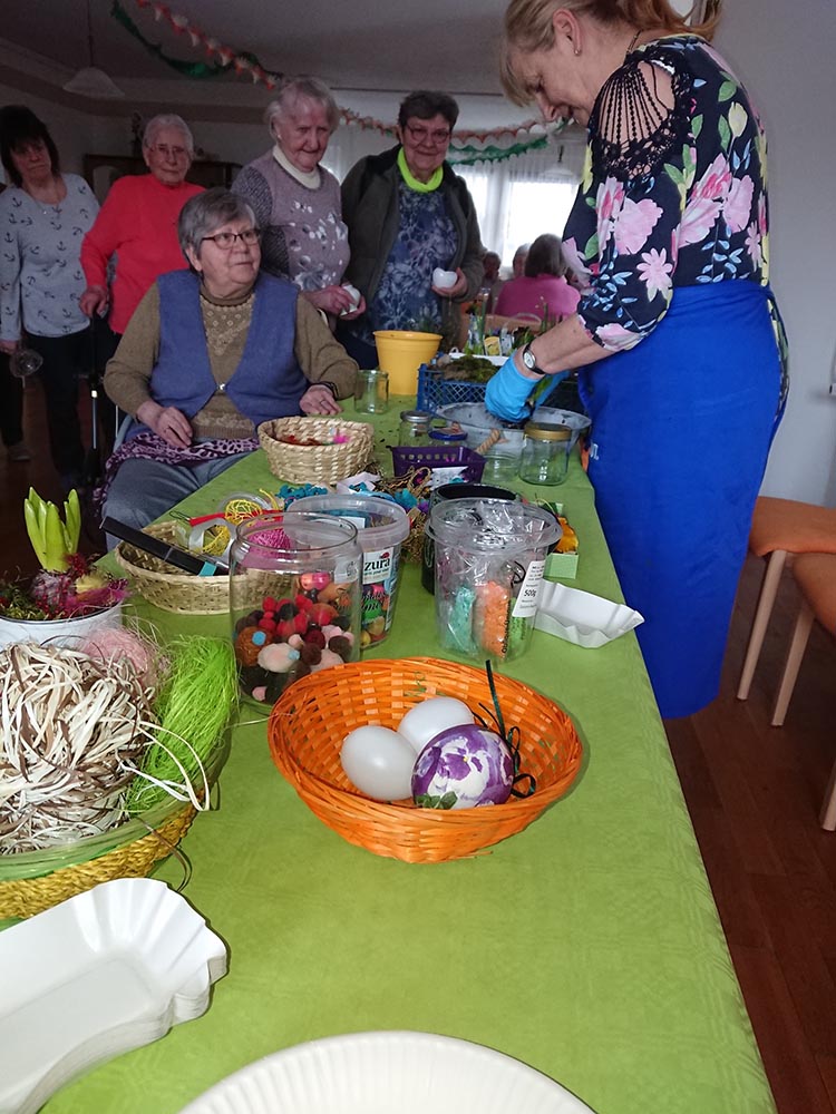 Im Anschluss wurde zum Gestalten eines bunten Frühlingsgesteckes geladen, wozu wir eine bunte Floristikecke aufgebaut hatten, wo sich die Damen ihre selbst mitgebrachten Gefäße mit Blumen bepflanzen und dekorieren konnten. So sind zahlreiche blühende Kunstwerke entstanden.