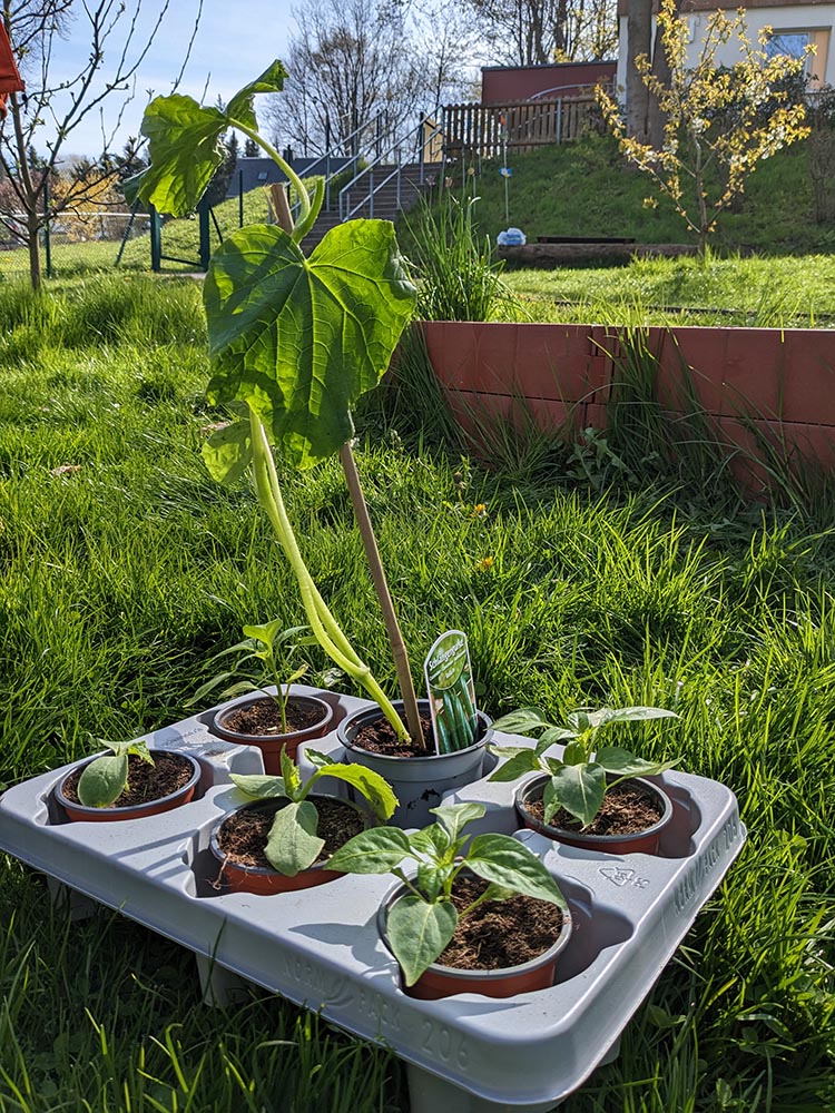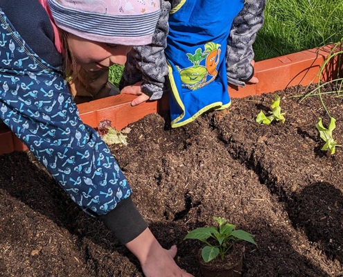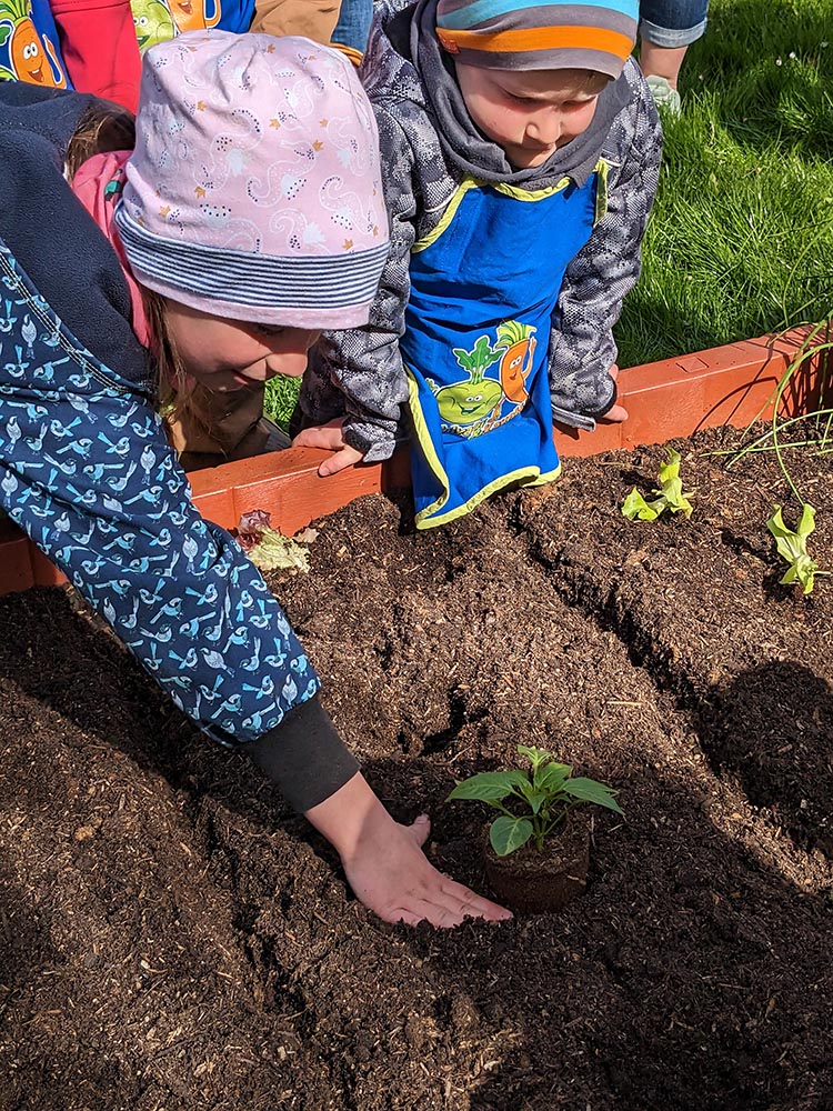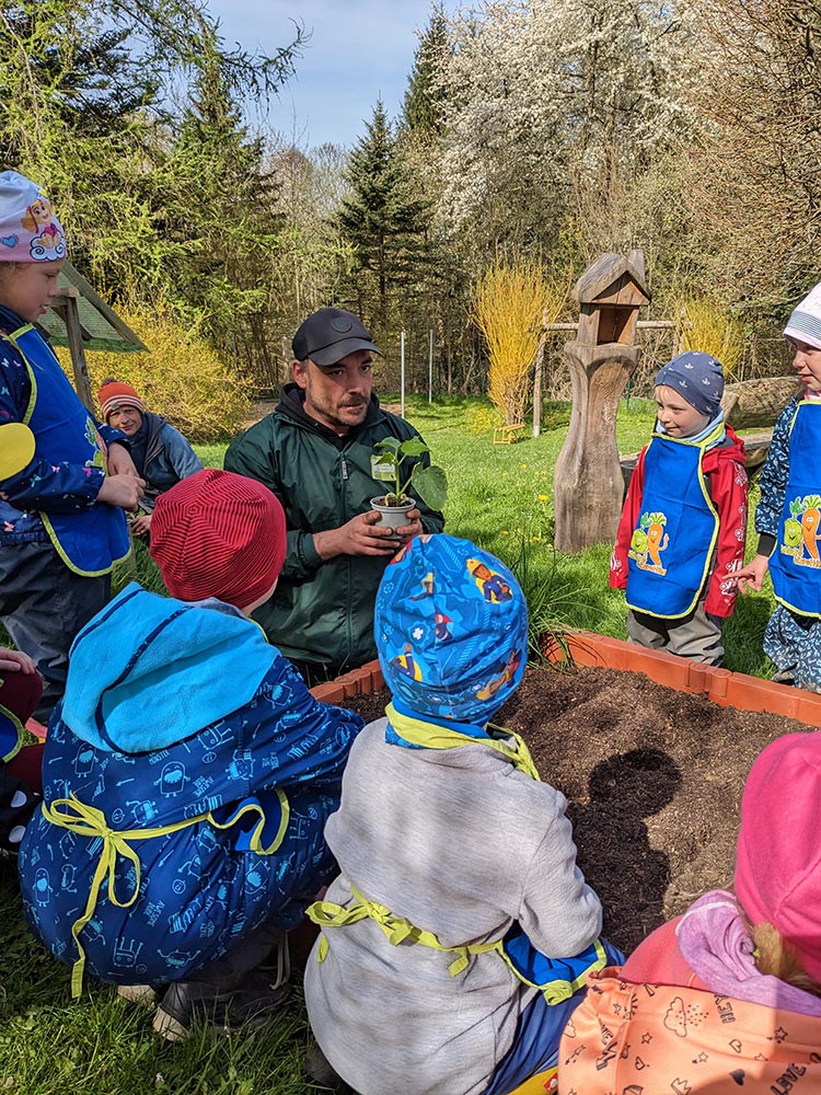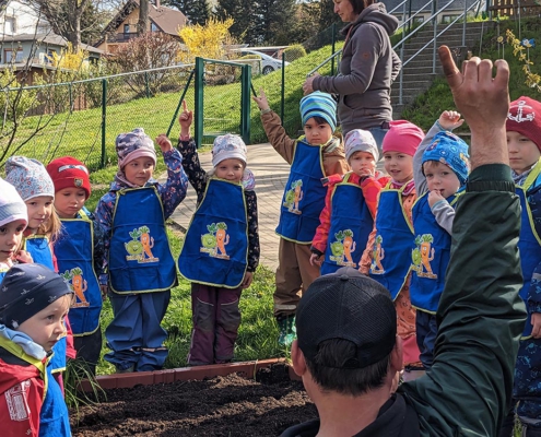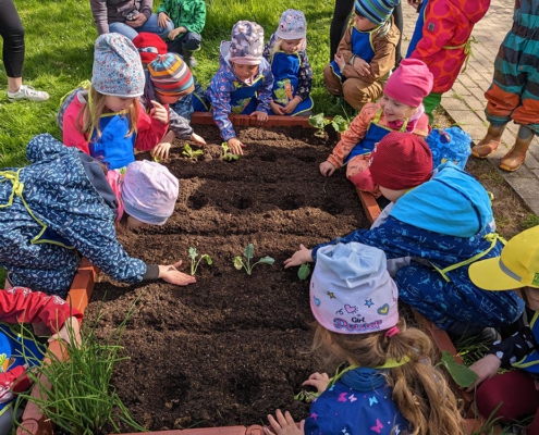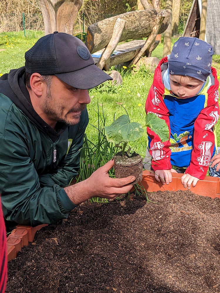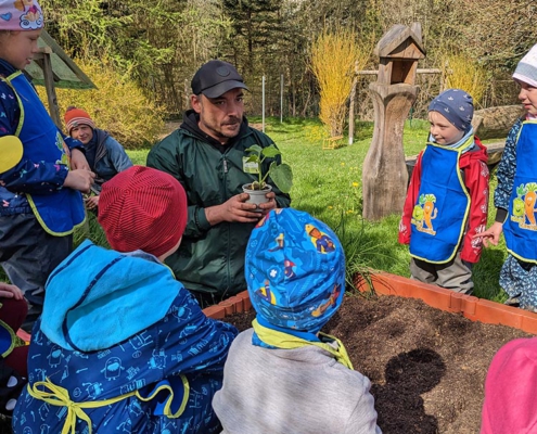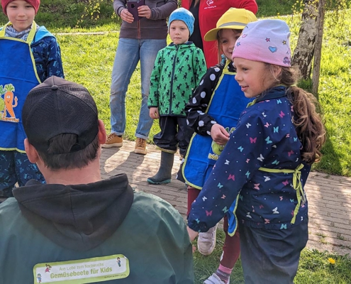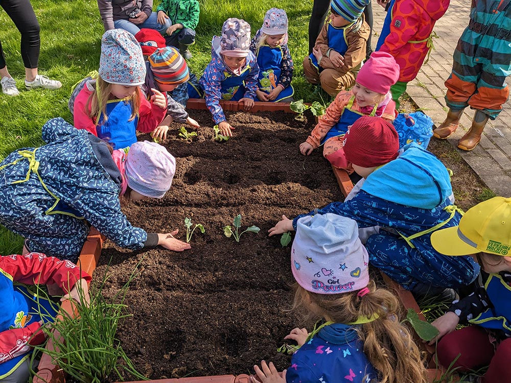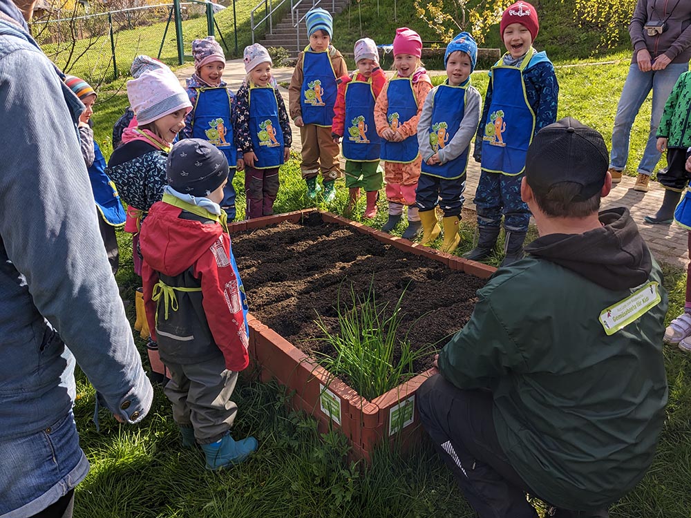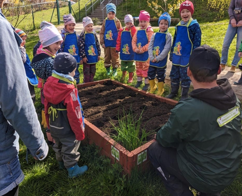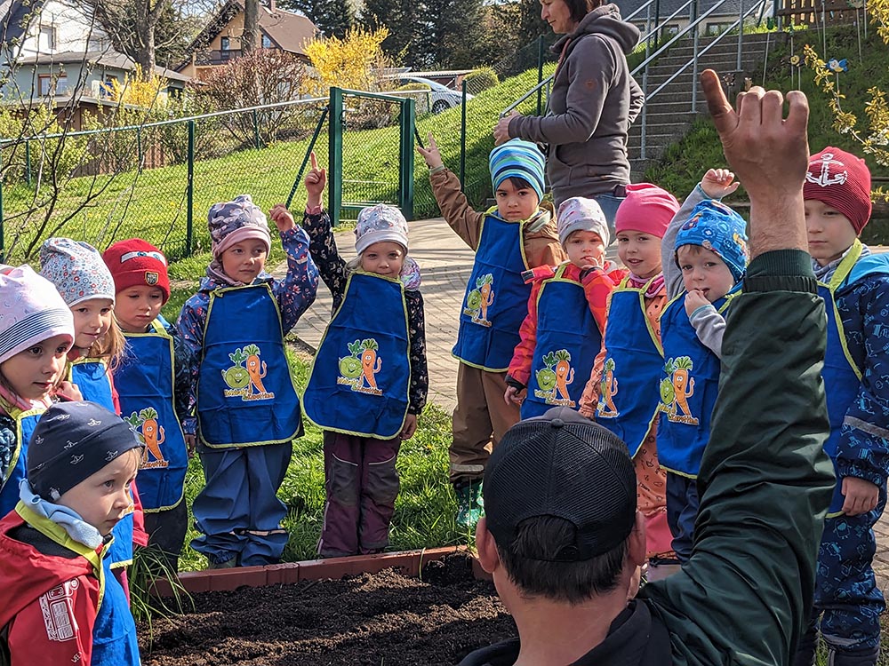 Während des Vormittags wurde den Kindern naturnah der Aufbau und das Wachstum von Pflanzen erklärt. Jedes Kind wurde Teil des Gesprächs und berichtete von eigenen Erfahrungen mit Gemüse, Obst und gesunder Ernährung. Mit allen Sinnen erlebten die Kinder die ersten Schritte auf dem Weg zum gesunden Snack und werden sich auch in Zukunft um die kleinen Pflanzen kümmern, bis sie in einigen Wochen geerntet, verarbeitet oder pur gegessen werden können.