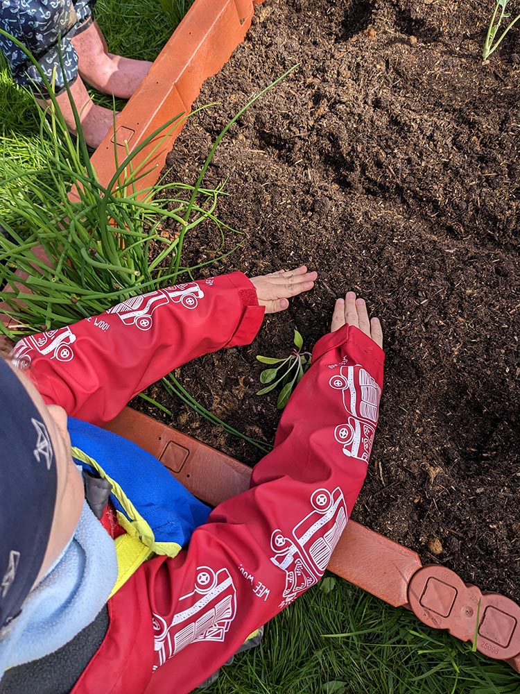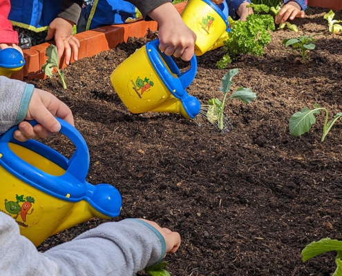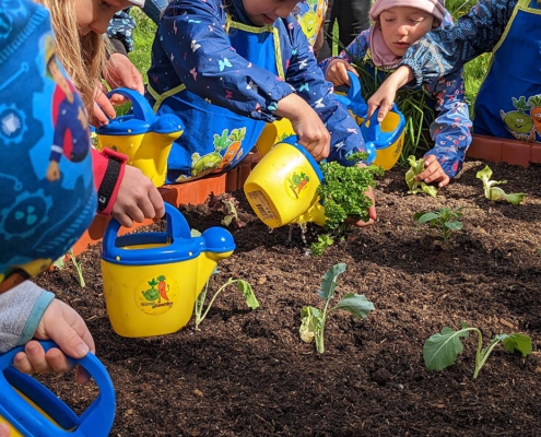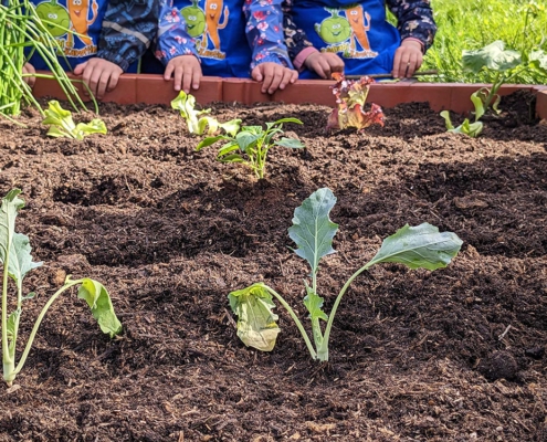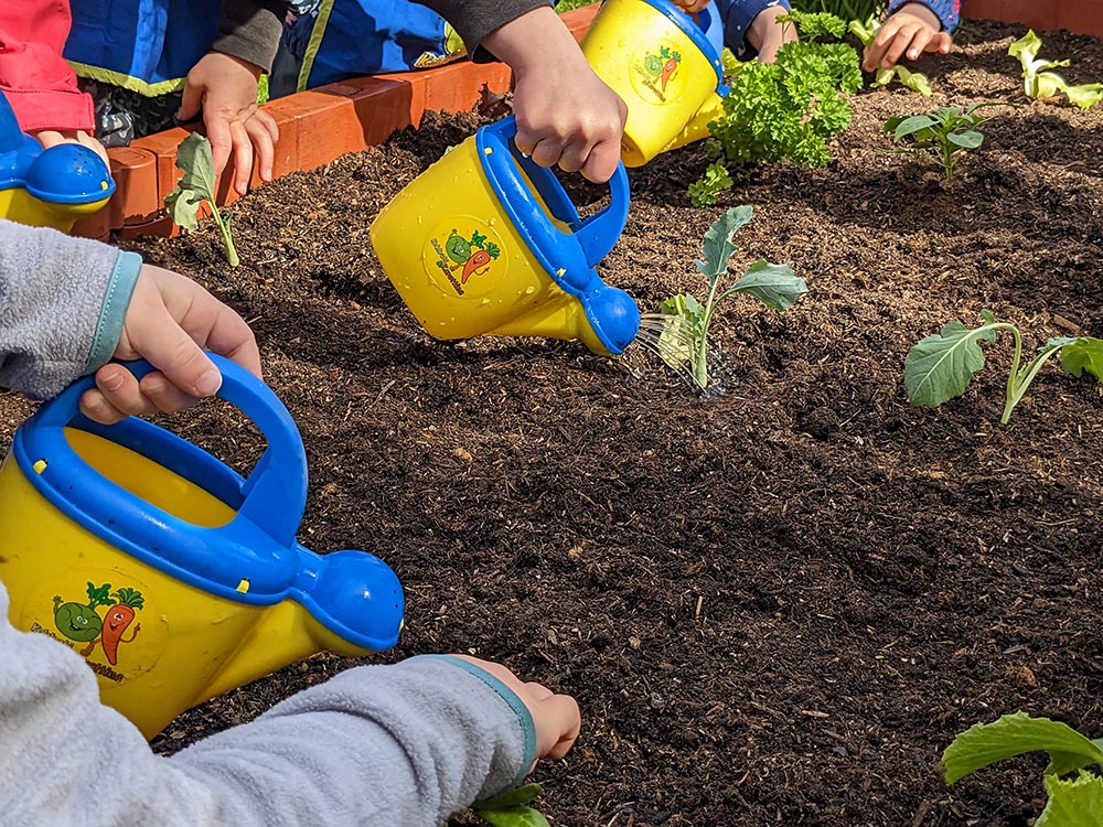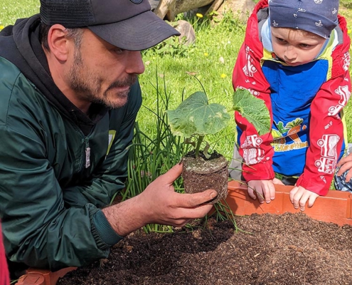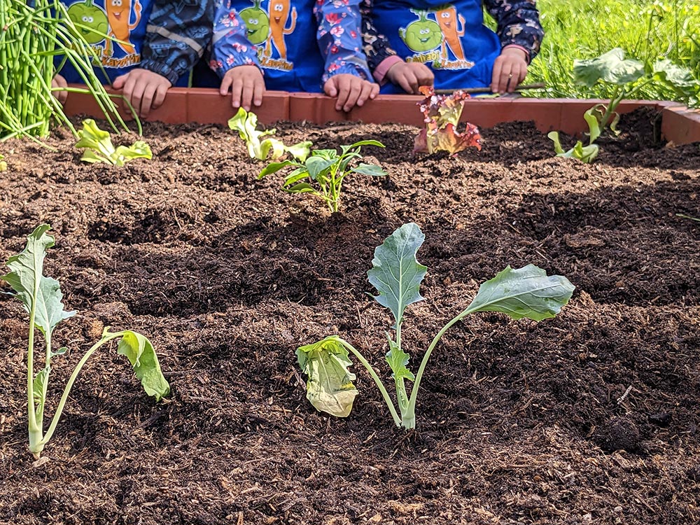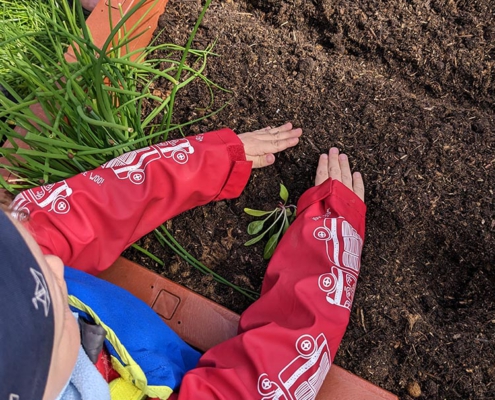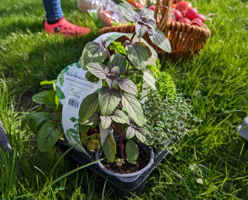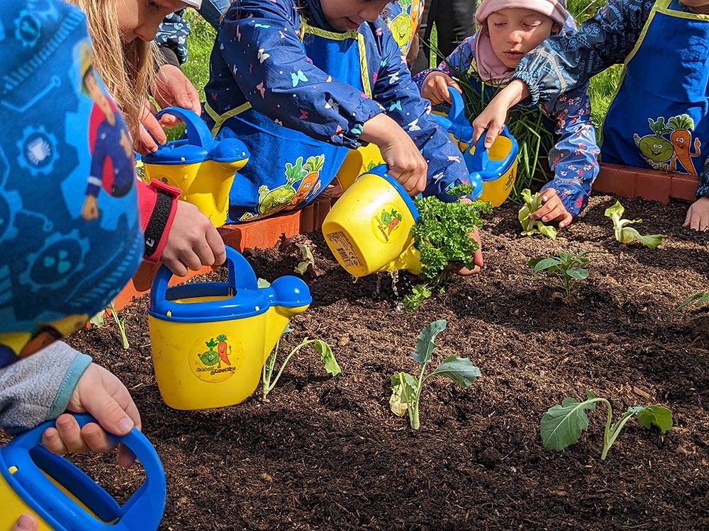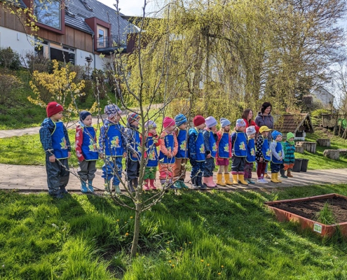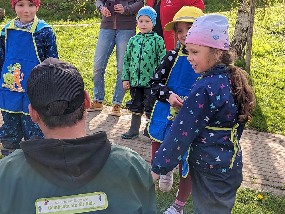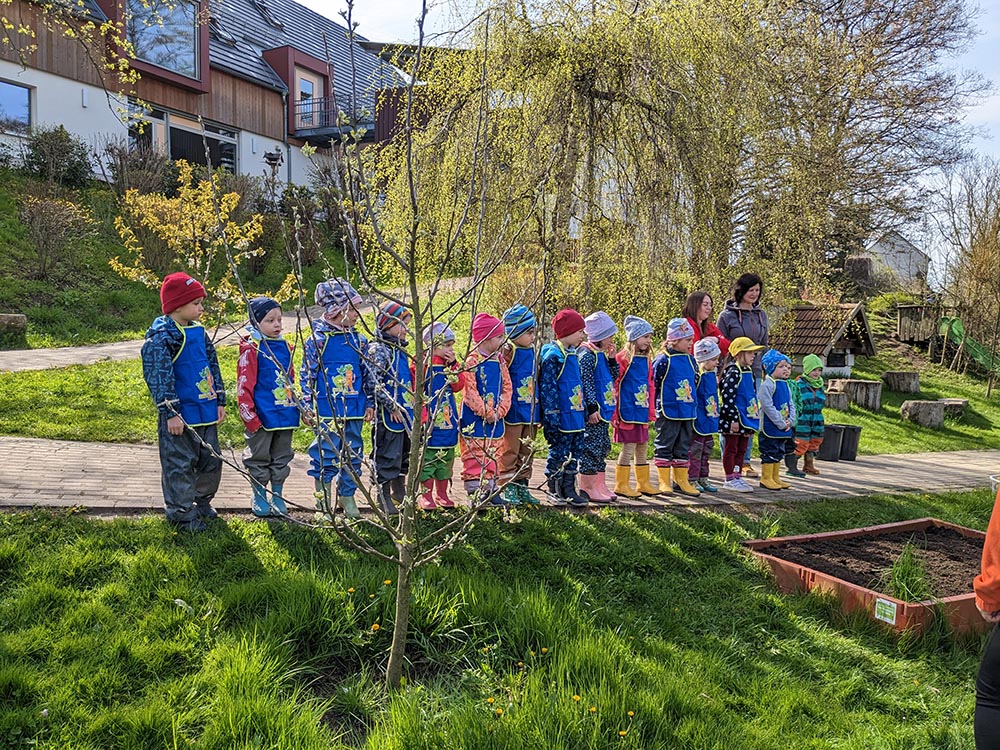 Während des Vormittags wurde den Kindern naturnah der Aufbau und das Wachstum von Pflanzen erklärt. Jedes Kind wurde Teil des Gesprächs und berichtete von eigenen Erfahrungen mit Gemüse, Obst und gesunder Ernährung. Mit allen Sinnen erlebten die Kinder die ersten Schritte auf dem Weg zum gesunden Snack und werden sich auch in Zukunft um die kleinen Pflanzen kümmern, bis sie in einigen Wochen geerntet, verarbeitet oder pur gegessen werden können.