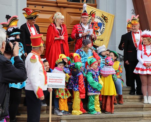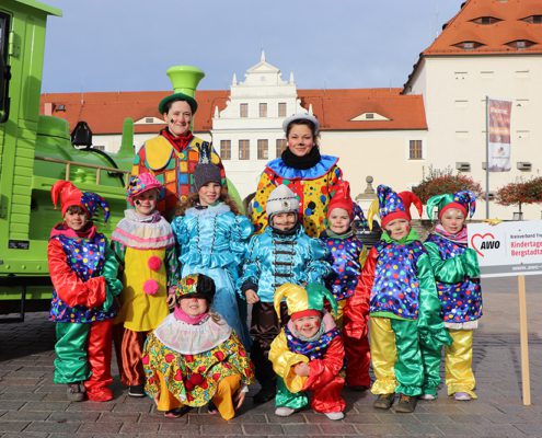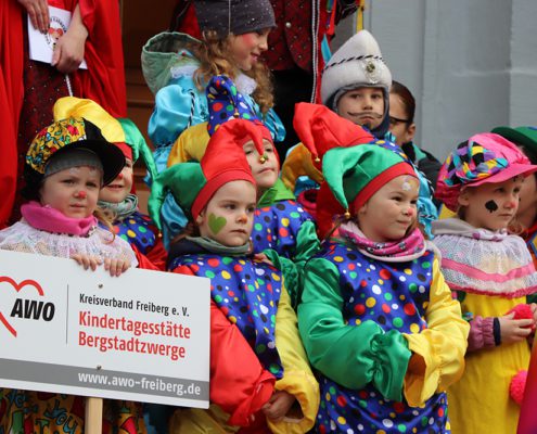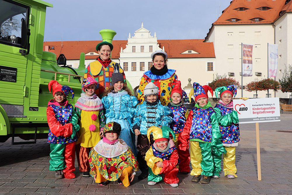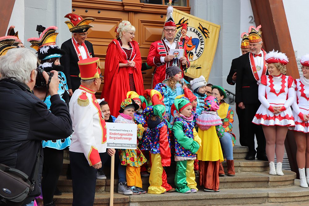 Traditionell wurde auch aus den Reihen der AWO-Kindertagesstätte „Bergstadtwerge“ ein „kleines“ Prinzenpaar gestellt. Prinzessin Emma und Prinz Theodor begrüßten dabei die zahlreich erschienenen Gäste auf dem Obermarkt. Gemeinsam mit den Clownies durfte das Team der Bergstadtzwerge mit der Silberbahn bis zum Obermarkt reisen. Welch tolles Erlebnis für unsere Kleinen. Die Aufregung war groß, jedoch hatten unsere Erzieherinnen die Kinder super eingestimmt und vorbereitet, um vor dem großen Publikum ihre Worte zu präsentieren. Das habt ihr super gemeistert!