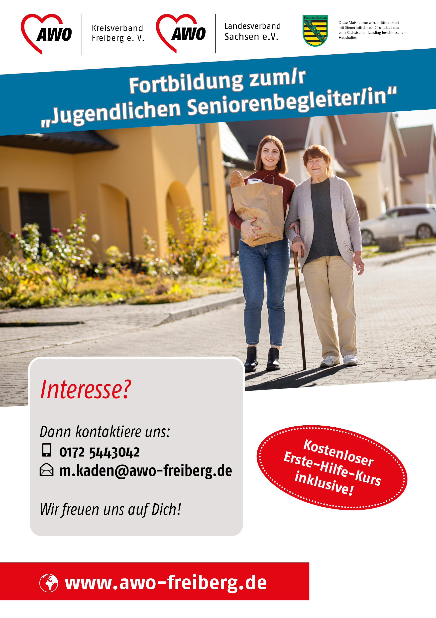 Der Fortbildungskurs „Jugendliche/r Seniorenbegleiter/in“ richtet sich an die Schülerinnen und Schüler der 8. und 9. Klassen und wird im Rahmen des von der Schule vorgeschriebenen Schülerpraktikums beim AWO Kreisverband Freiberg absolviert.