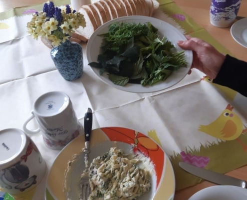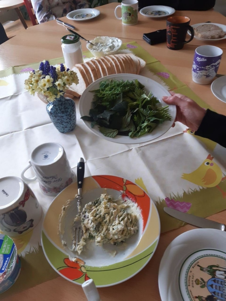 Zurück in den Räumen der SPFH bereiteten Mütter und Pädagogen Kräuterbutter und Tee zu. In geselliger Runde ließen sich alle den frisch gebrühten Brennnesseltee und die Kräuterbutter auf frischem, knusprigen Brot schmecken.