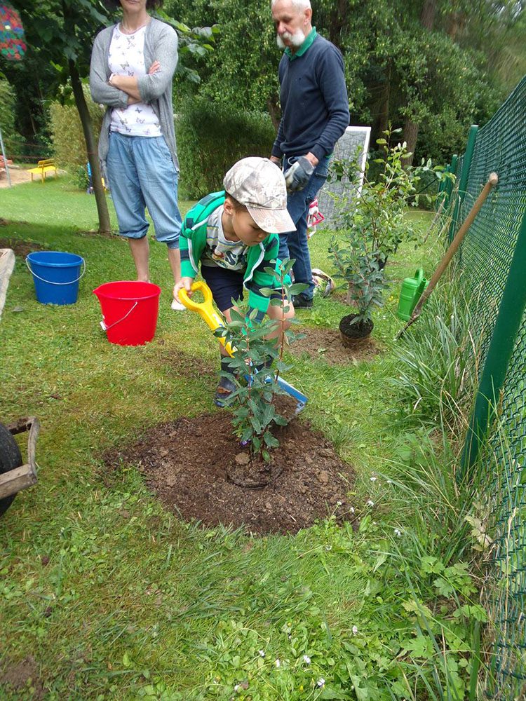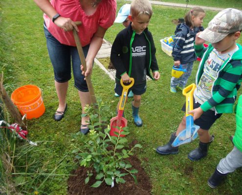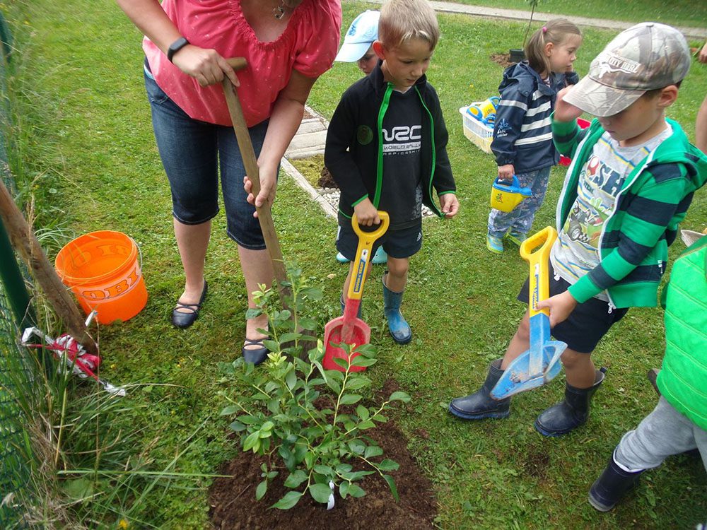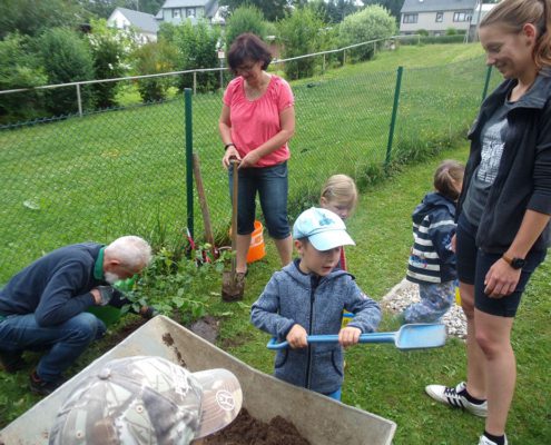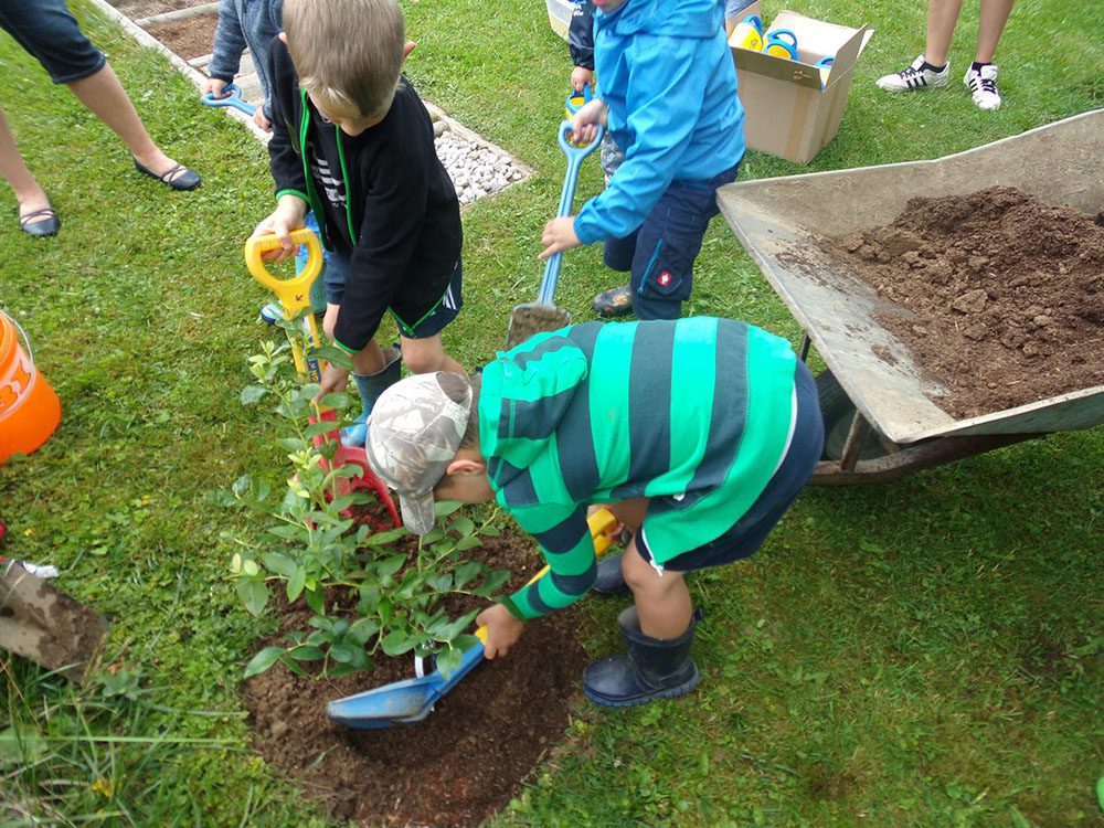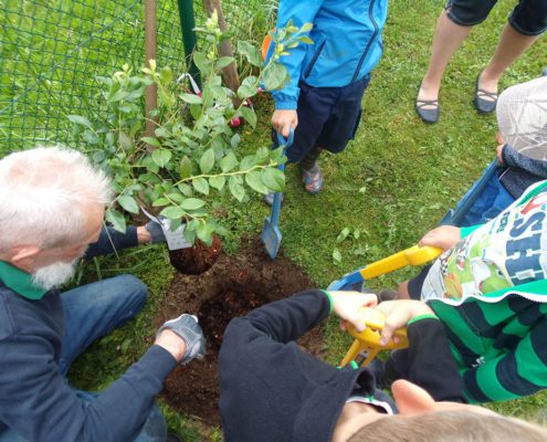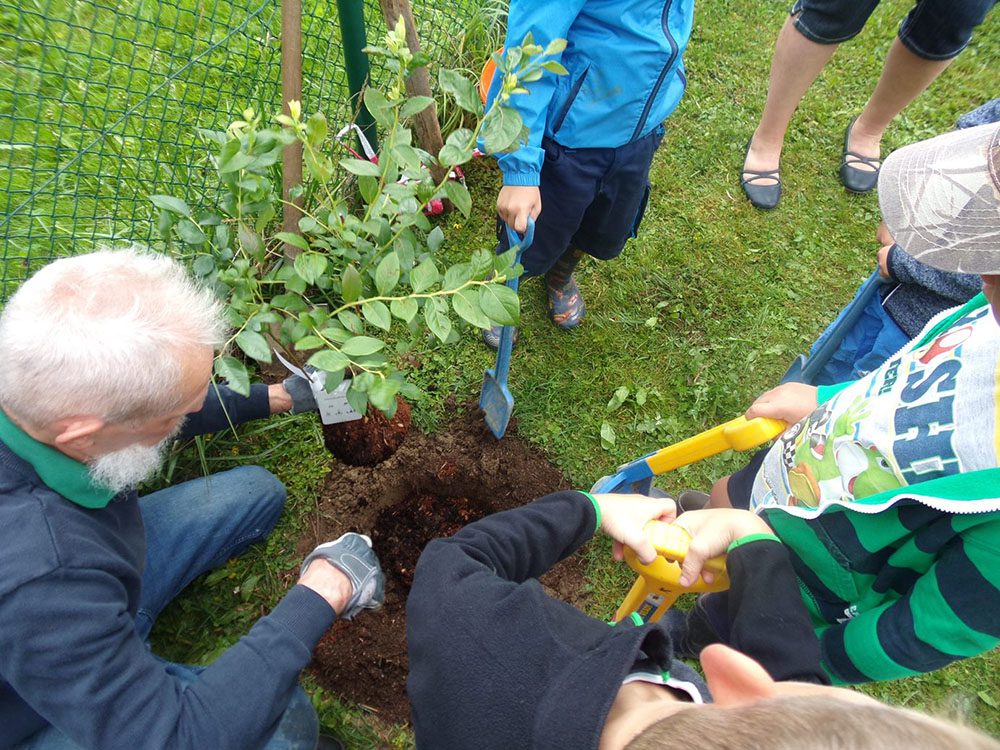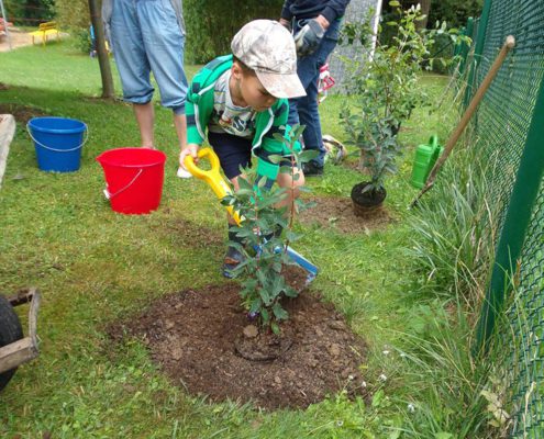 Jetzt konnten wir mit Unterstützung von Frau Bleiber von der Allianz Versicherung und ihrem Projekt „Blauer Adler“ zu den Gemüsebeeten einen Obstgarten anlegen. Heidel-, Johannis- und Himbeeren wachsen jetzt ebenso in unserem Kitagelände, wie Felsenbirne, Sauerkirschen und ein Apfelbaum.