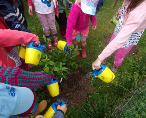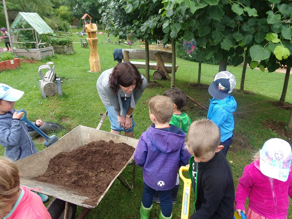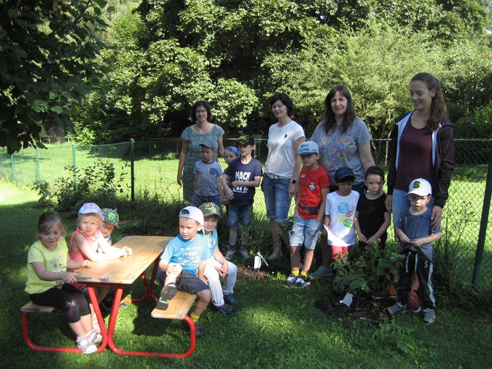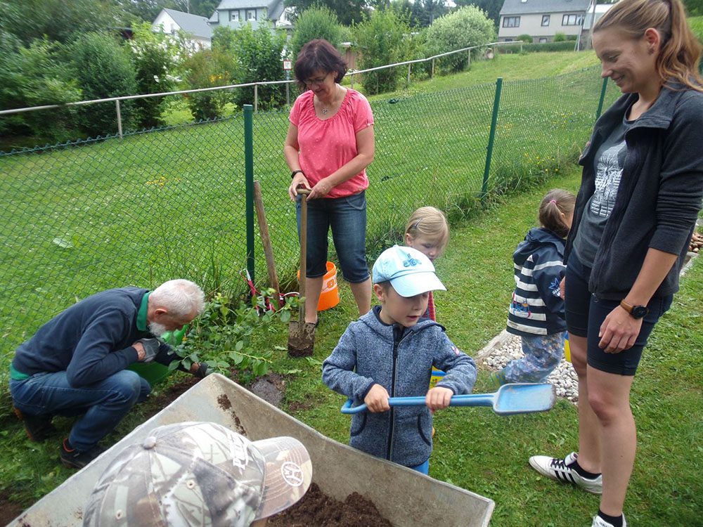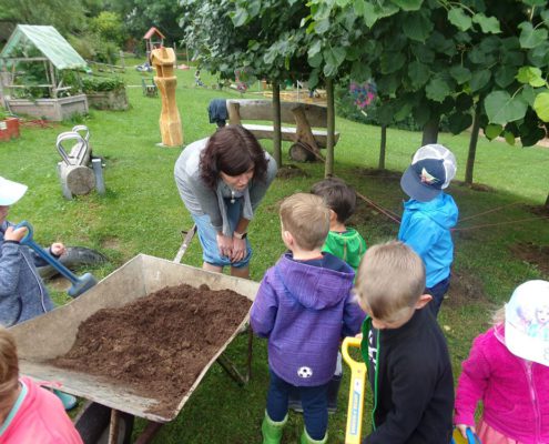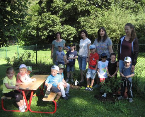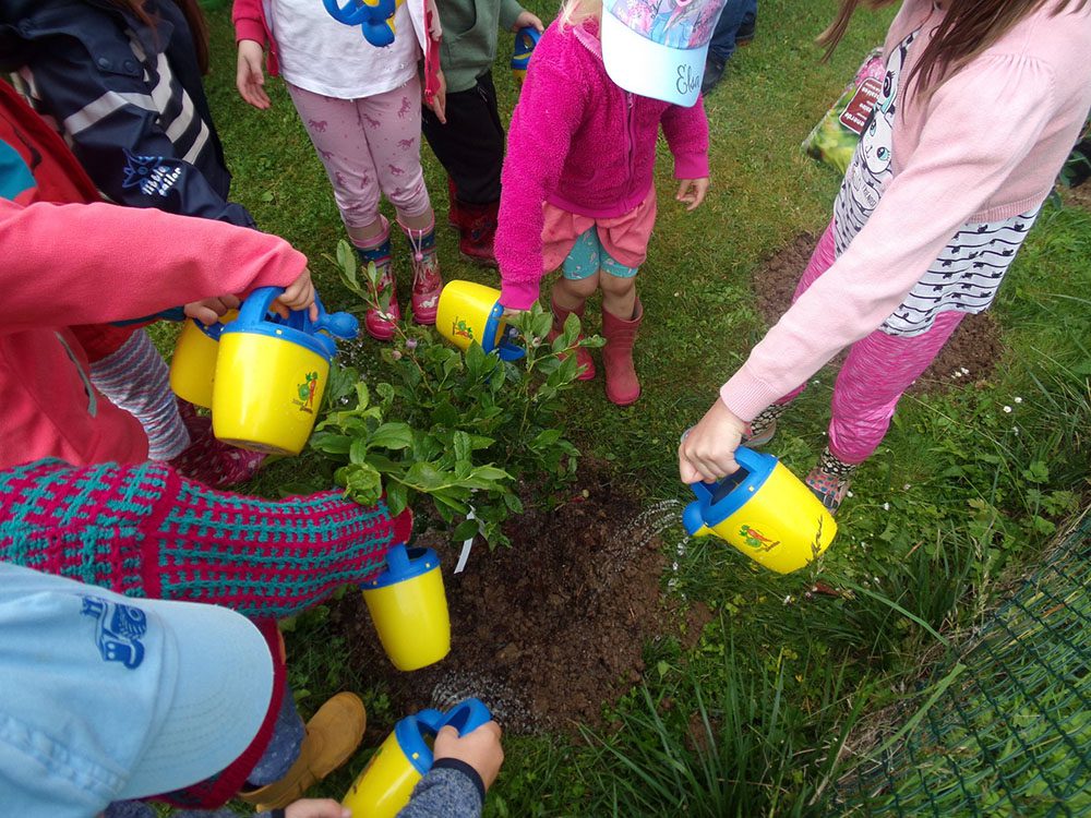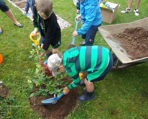 Jetzt konnten wir mit Unterstützung von Frau Bleiber von der Allianz Versicherung und ihrem Projekt „Blauer Adler“ zu den Gemüsebeeten einen Obstgarten anlegen. Heidel-, Johannis- und Himbeeren wachsen jetzt ebenso in unserem Kitagelände, wie Felsenbirne, Sauerkirschen und ein Apfelbaum.