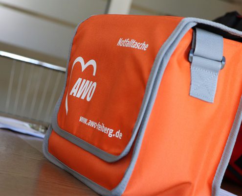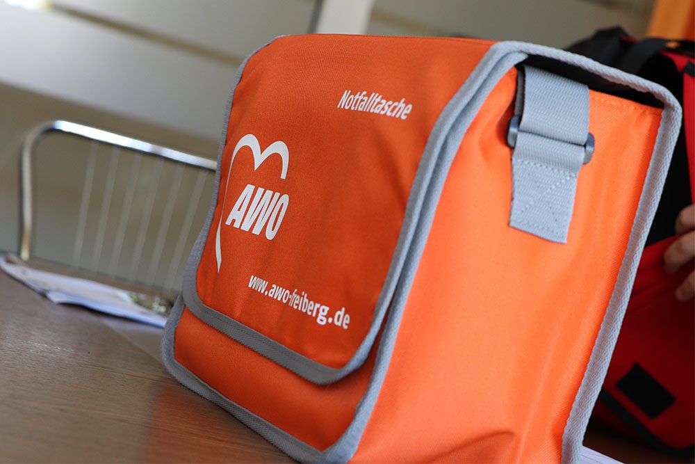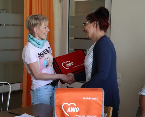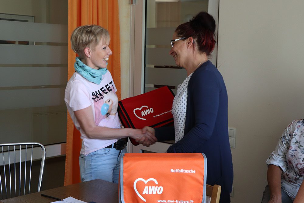 Neue Taschen für unser Pflegepersonal gab es während der Dienstberatung der Sozialstation Freiberg. Stellvertretend für alle Mitarbeiterinnen und Mitarbeiter nahm Katja Bochmann die Taschen in Empfang, die von Pflegedienstleiterin Natalie Heide übergeben wurden.