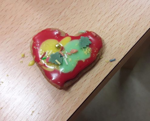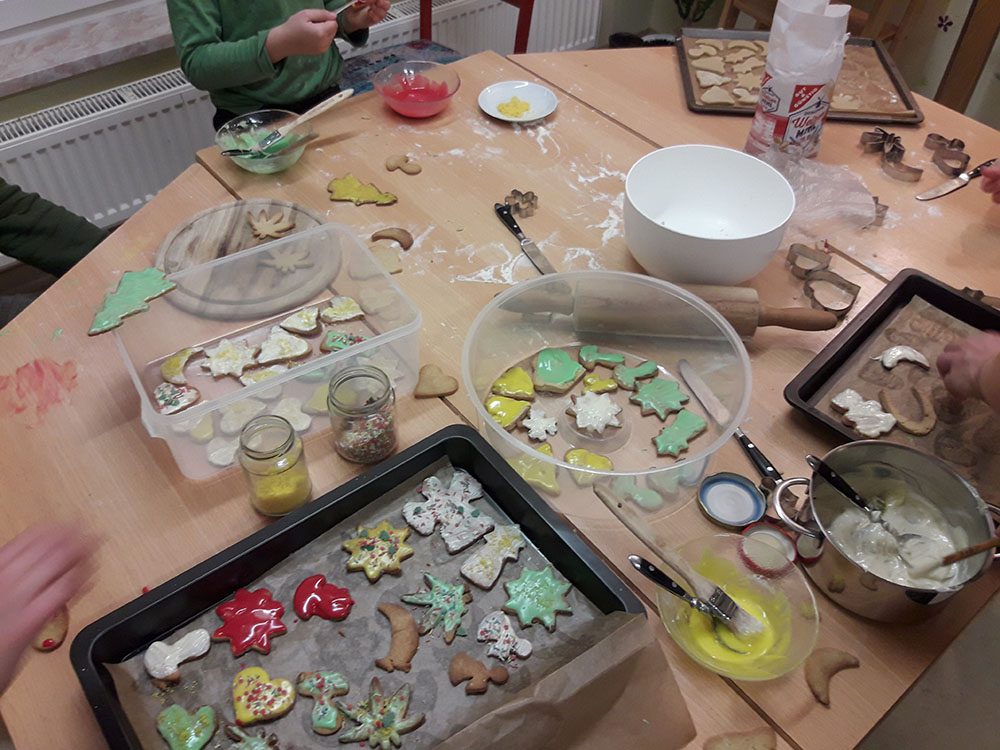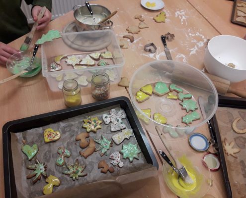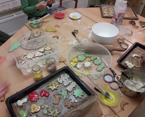 …konnte man im Dezember in den Räumen der Sozialpädagogischen Familienhilfe wahrnehmen. Die Mitarbeiterinnen zauberten mit den betreuten Familien so manches Kunstwerk und brachte so die Kinderaugen zum Leuchten. Genascht wurde natürlich auch.