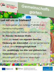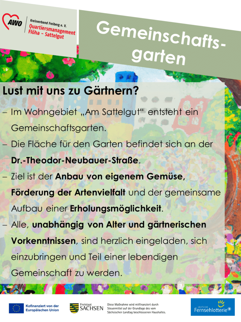 Im Wohngebiet Sattelgut entsteht in den kommenden Wochen und Monaten ein Gemeinschaftsgarten. Bereits seit einem Jahr arbeitet ein Organisationsteam, bestehend aus engagierten Bewohner:innen, dem AWO Quartiersmanagement und der Stadtverwaltung Flöha, an der Planung des Projekts. Die Fläche für den Garten befindet sich an der Dr.-Theodor-Neubauer-Straße, oberhalb des UFO Jugendzentrums.