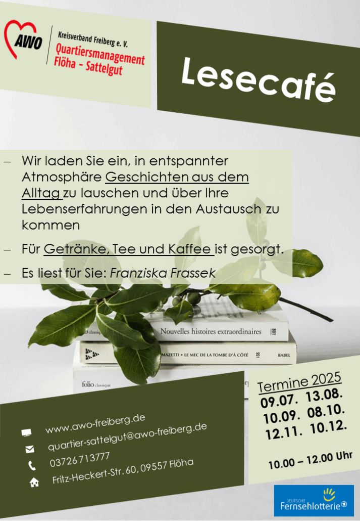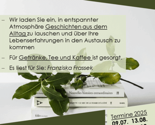 09.07. / 13.08. / 10.09. / 08.10. / 12.11. / 10.12.2025Lesecafé10:00 – 12:00 Uhr
