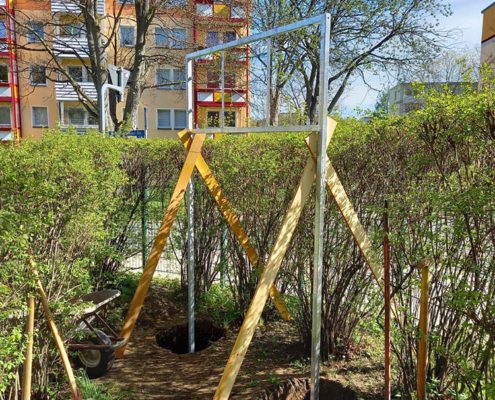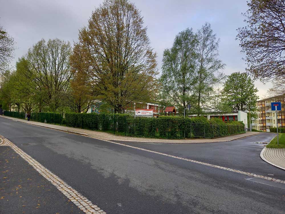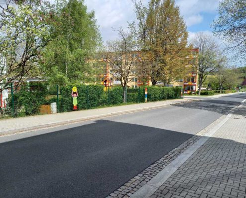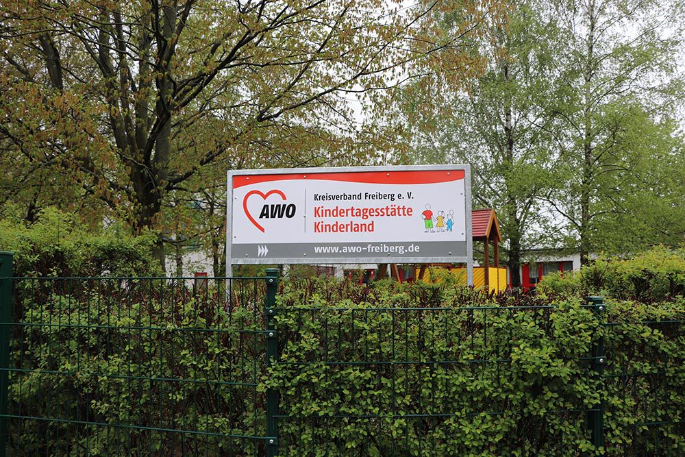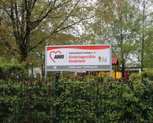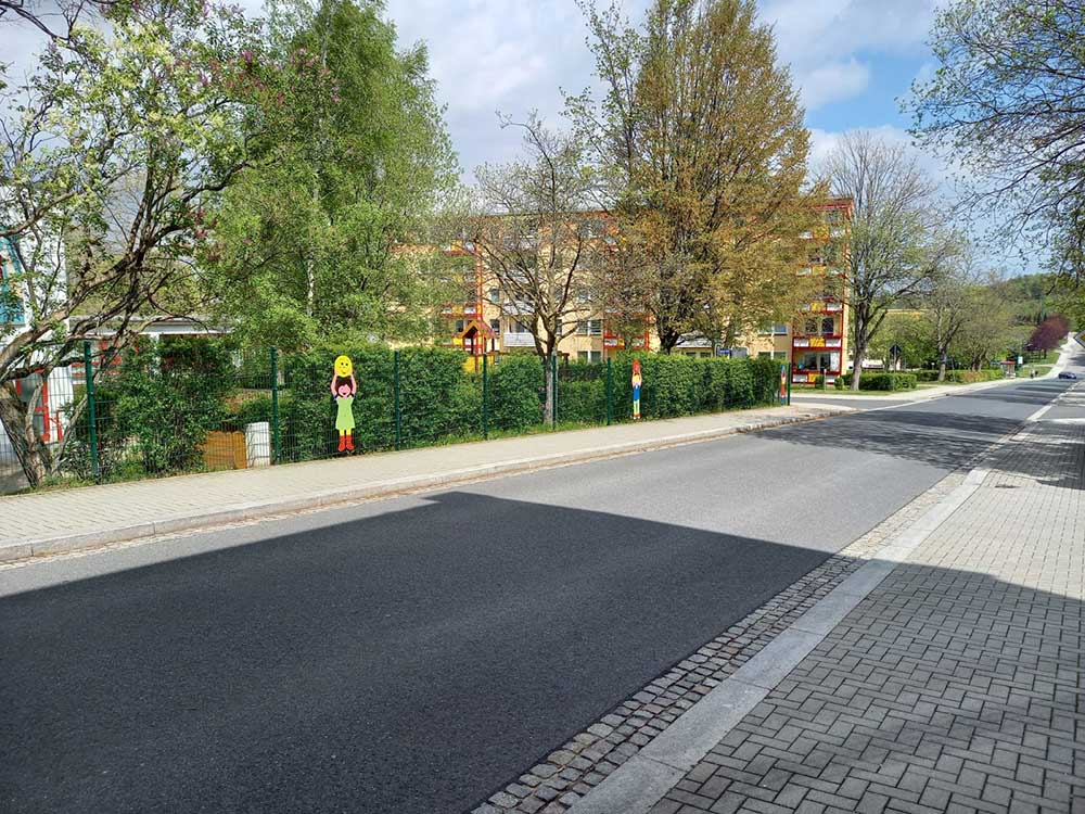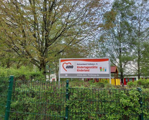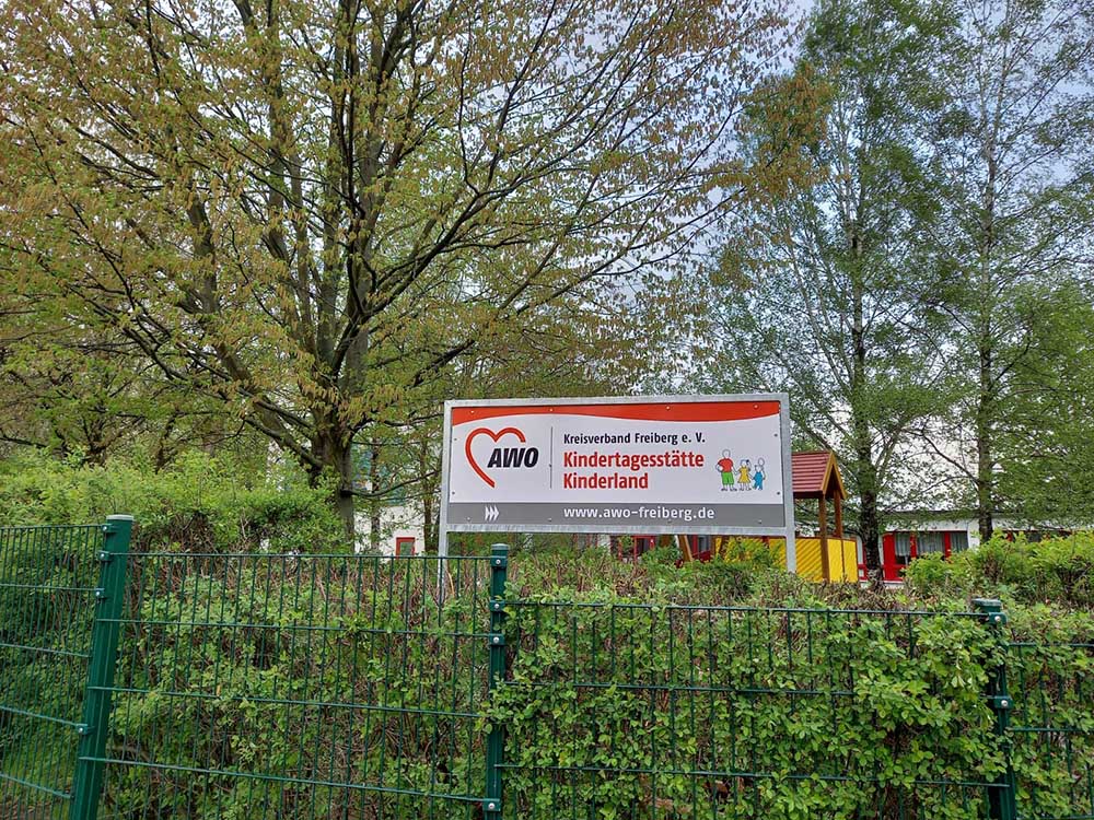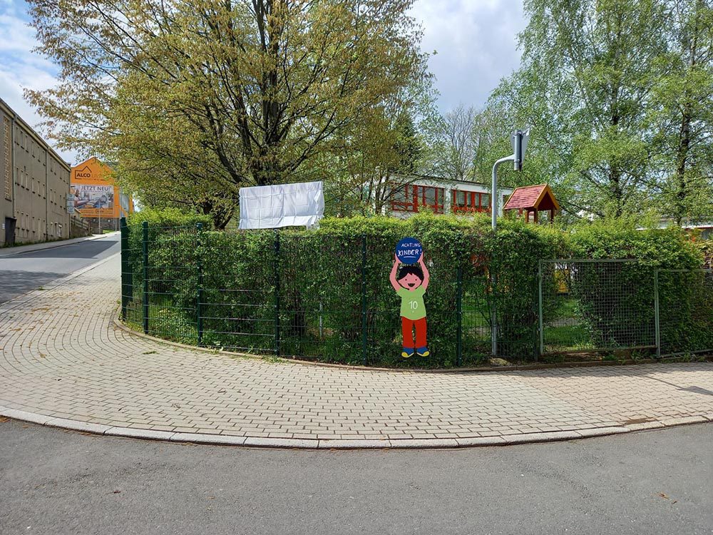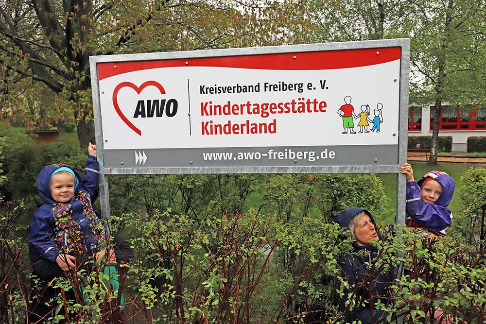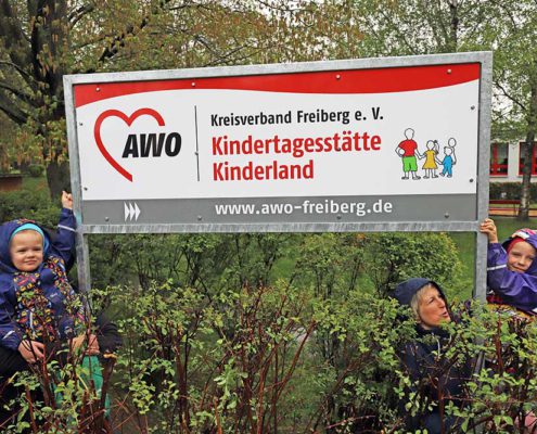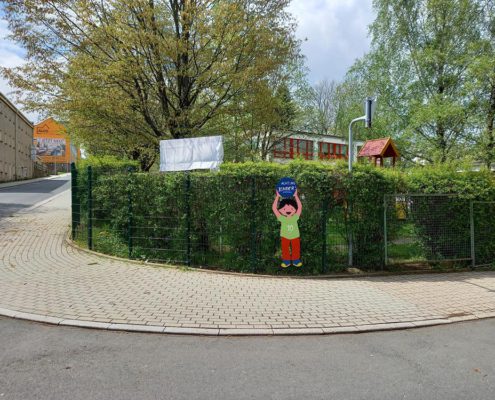Ein neues Schild an der Dr.-W.-Külz-Straße in Brand-Erbisdorf präsentiert nun unsere Kindertagesstätte. Jonas und Roxy waren die beiden Kinder, die sich dem Regen stellten und das Schild enthüllen durften.