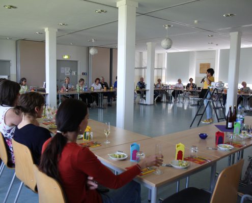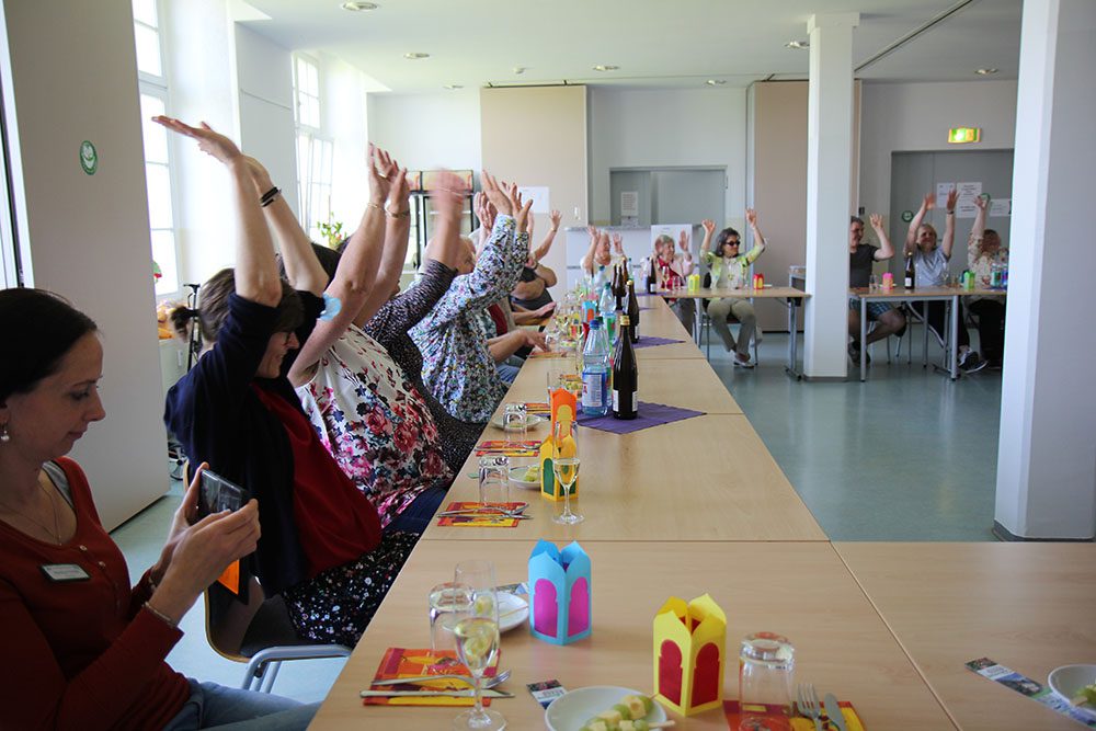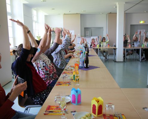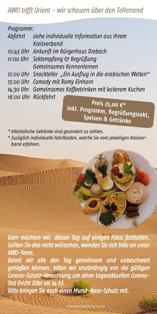 Ab 11:00 Uhr begrüßten wir Mitarbeitenden der AWOs die Gäste und stellten unsere Kreisverbände kurz vor. Ins Lachyoga wurden wir von Romy Einhorn eingeführt – eine sehr spannende Art, Entspannung und Freude zu finden… Kulinarisch schauten wir über den Tellerrand hinaus, denn unter dem Motto „AWO trifft Orient“ gab es einen Snackteller mit arabischem Flair. Das tolle Wetter zog uns in den Kräutergarten des Bürgerhauses. Eine Comedyeinlage sorgte für so manches herzhafte Lachen.