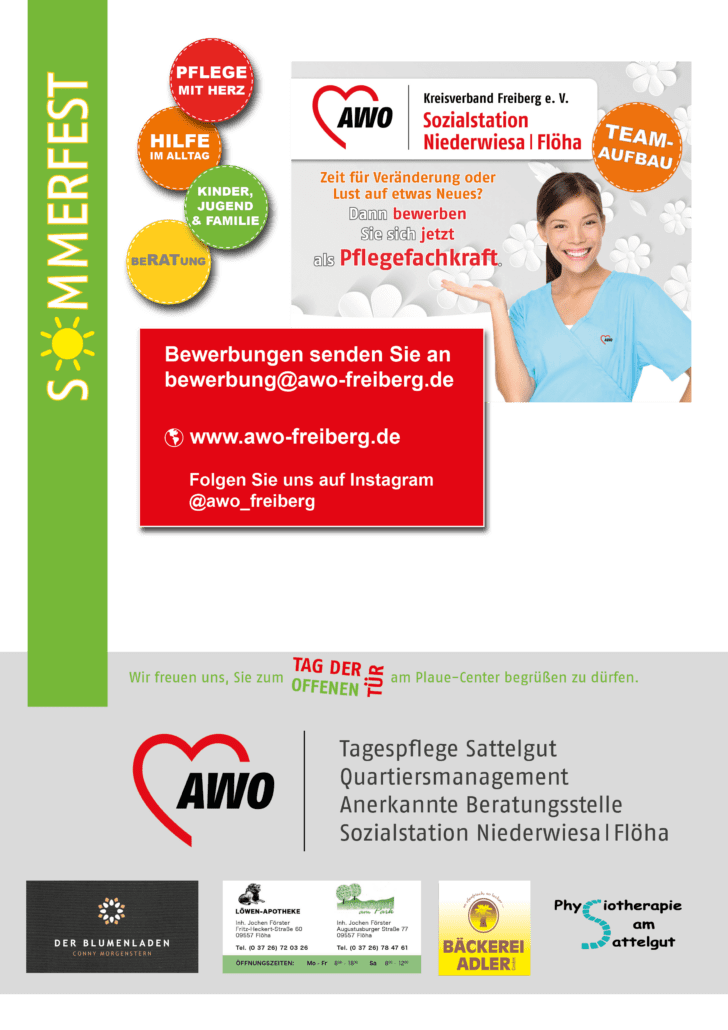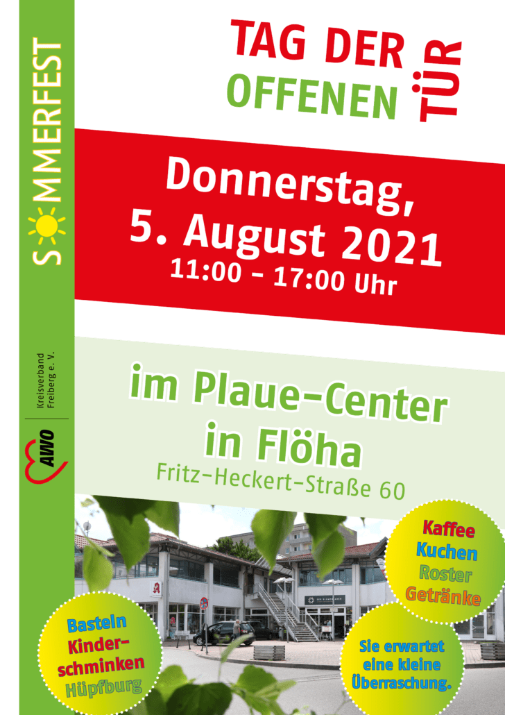 Der AWO Kreisverband Freiberg e. V. ist im Flöaher Plaue-Center mit einer Tagespflege, dem Quartiersmanagement, der Beratungsstelle für Schwangere und Familien und zukünftig auch mit der neuen Sozialstation ansässig.