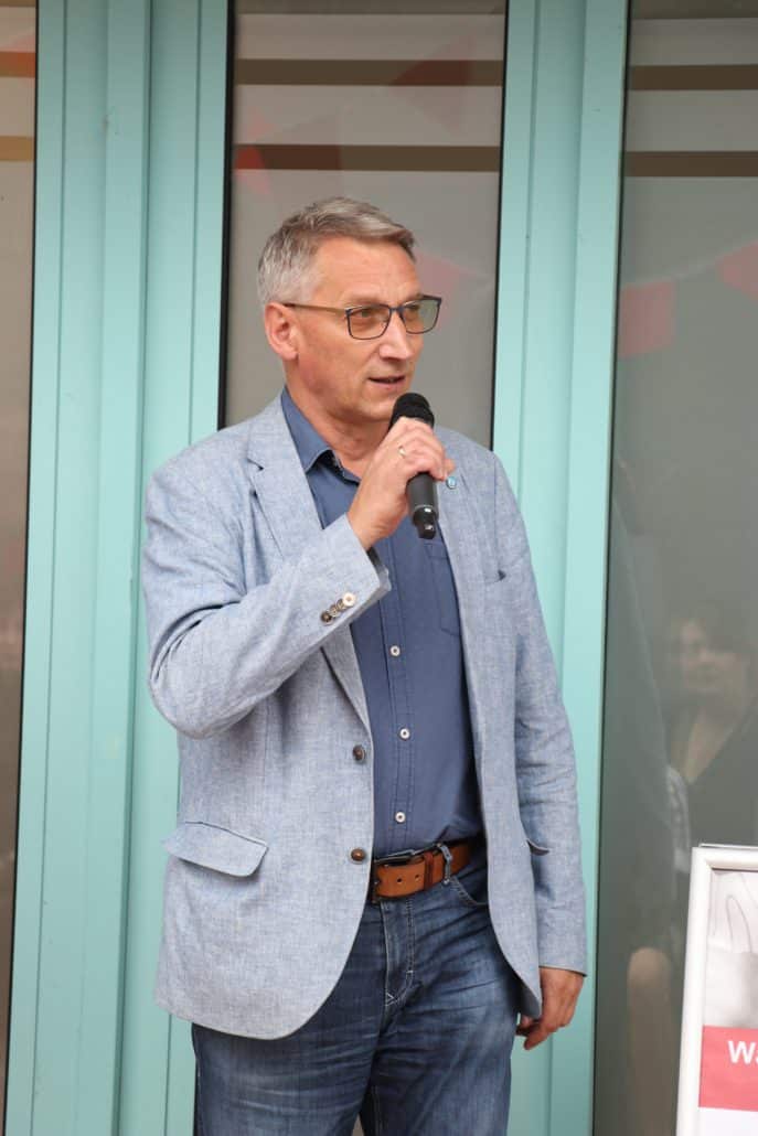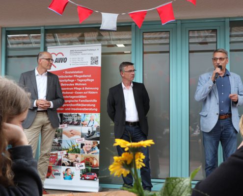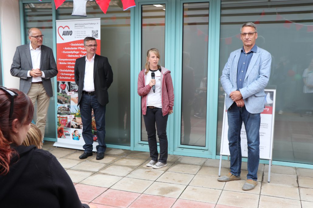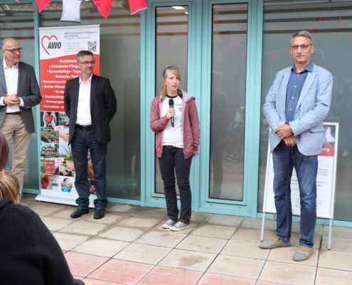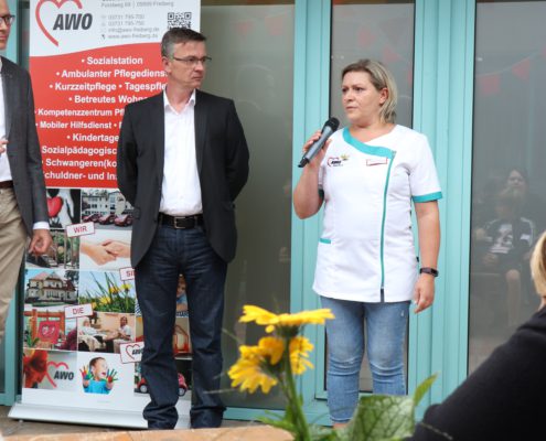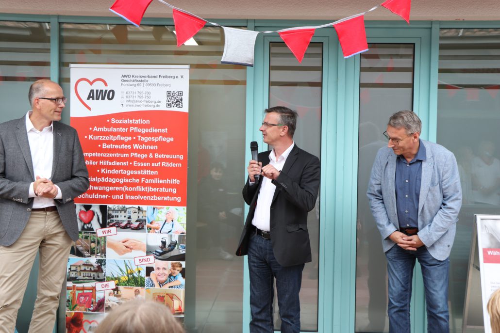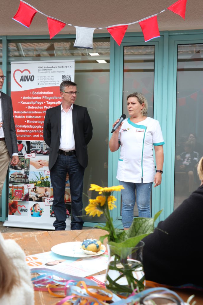 AWO-Geschäftsführer Jörg Lehmann sowie der Vermieter Klaus Wortmann begrüßen die Anwesenden. Bürgermeister der Großen Kreisstadt Flöha Volker Holuscha betonte in seiner Ansprache, wie froh er sei, mit der AWO einen großen Dienstleister vor Ort ansässig zu wissen. Dabei ist eine weitere Sozialstation im kommenden Jahr geplant, welche die Bedarfe der ambulanten Pflege decken soll.