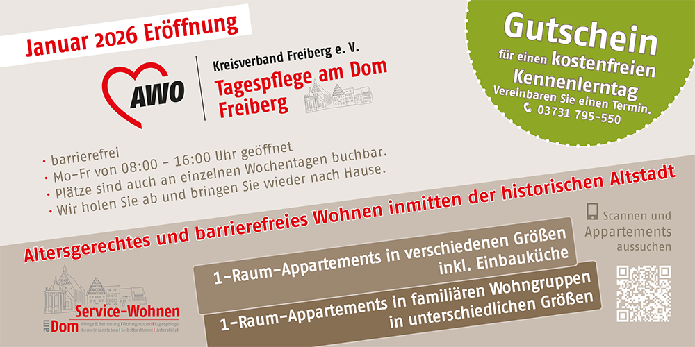 Die AWO-Tagespflege in Freiberg öffnet ab Januar 2026 im Gebäude des Service-Wohnen am Dom ihre Türen:
