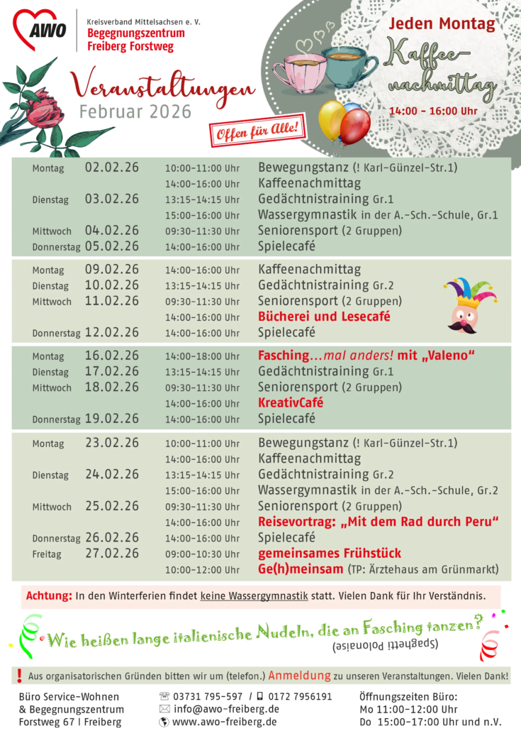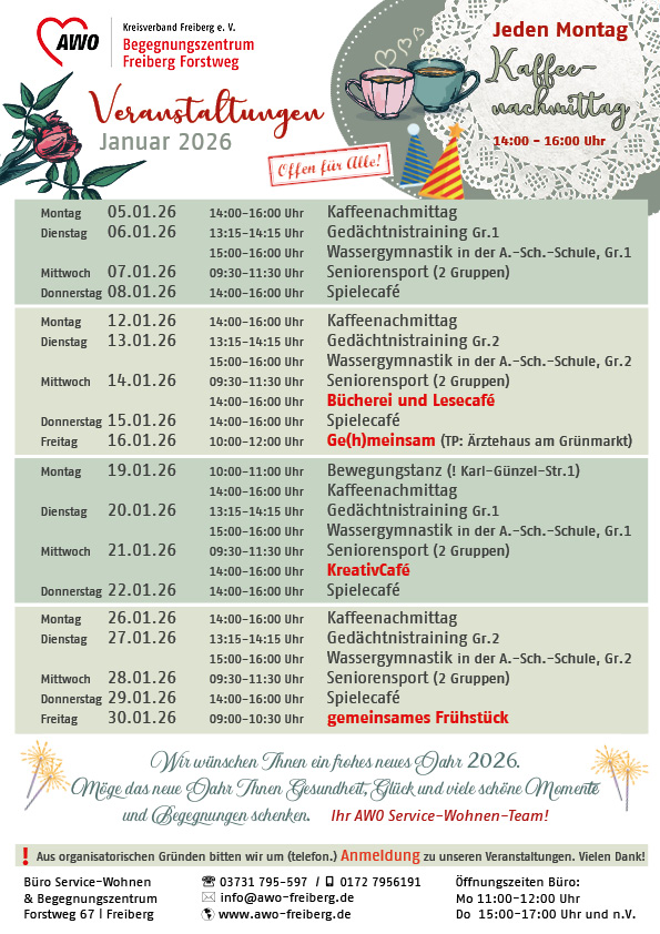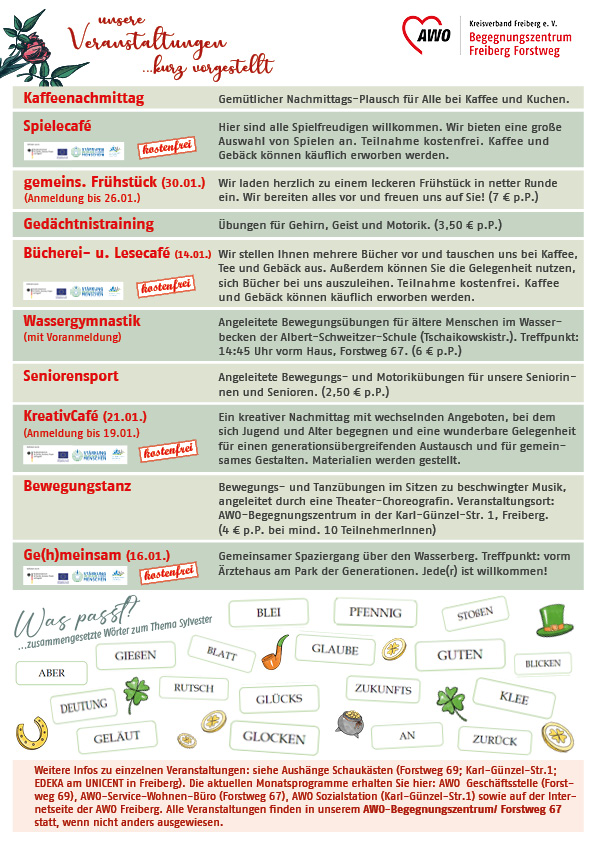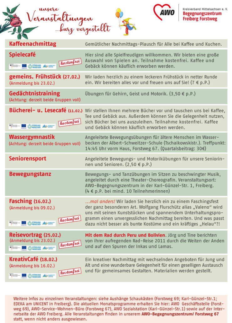 Hier finden Sie unser monatliches Veranstaltungsprogramm für unsere Begegnungszentren „Forstweg 67“ und „Karl-Günzel-Straße 1“ in Freiberg.