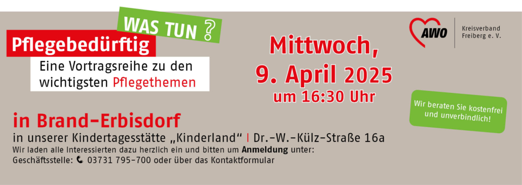 Der Vortrag findet am Donnerstag, 09.04. um 16:30 Uhr im AWO Kindertagesstätte „Kinderland“ auf der Dr.-W.-Külz-Straße 16a in Brand-Erbisdorf statt.