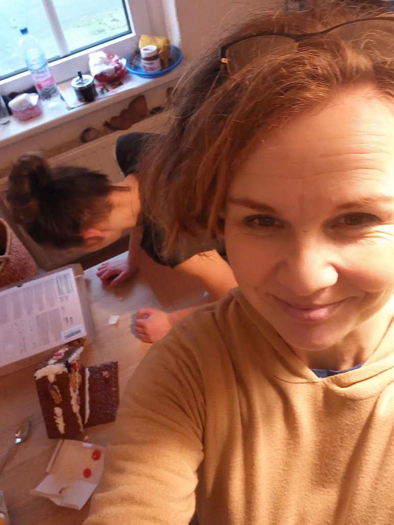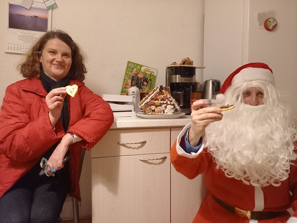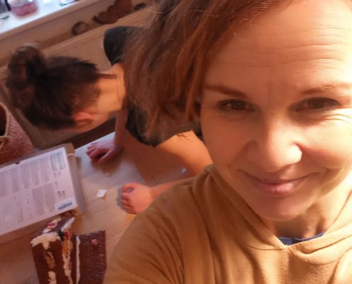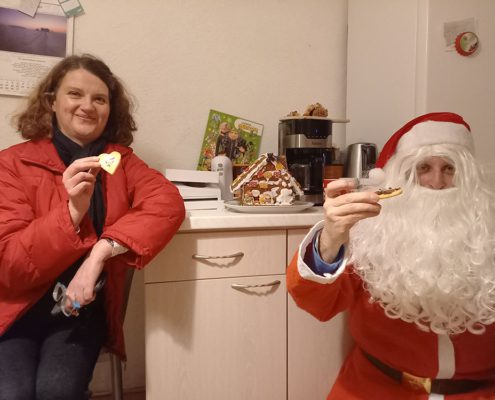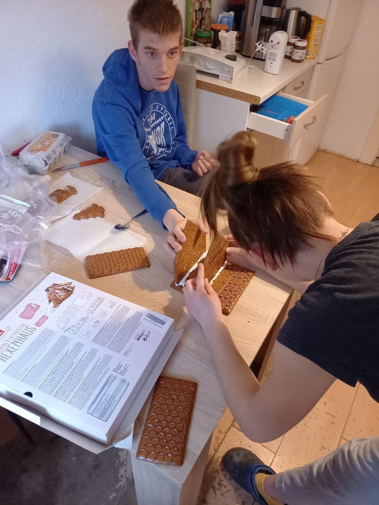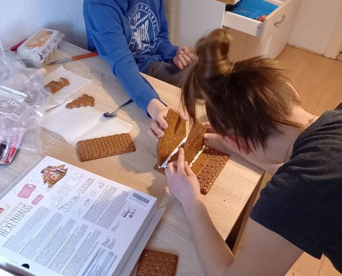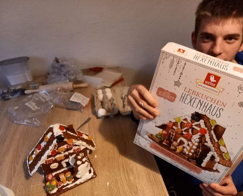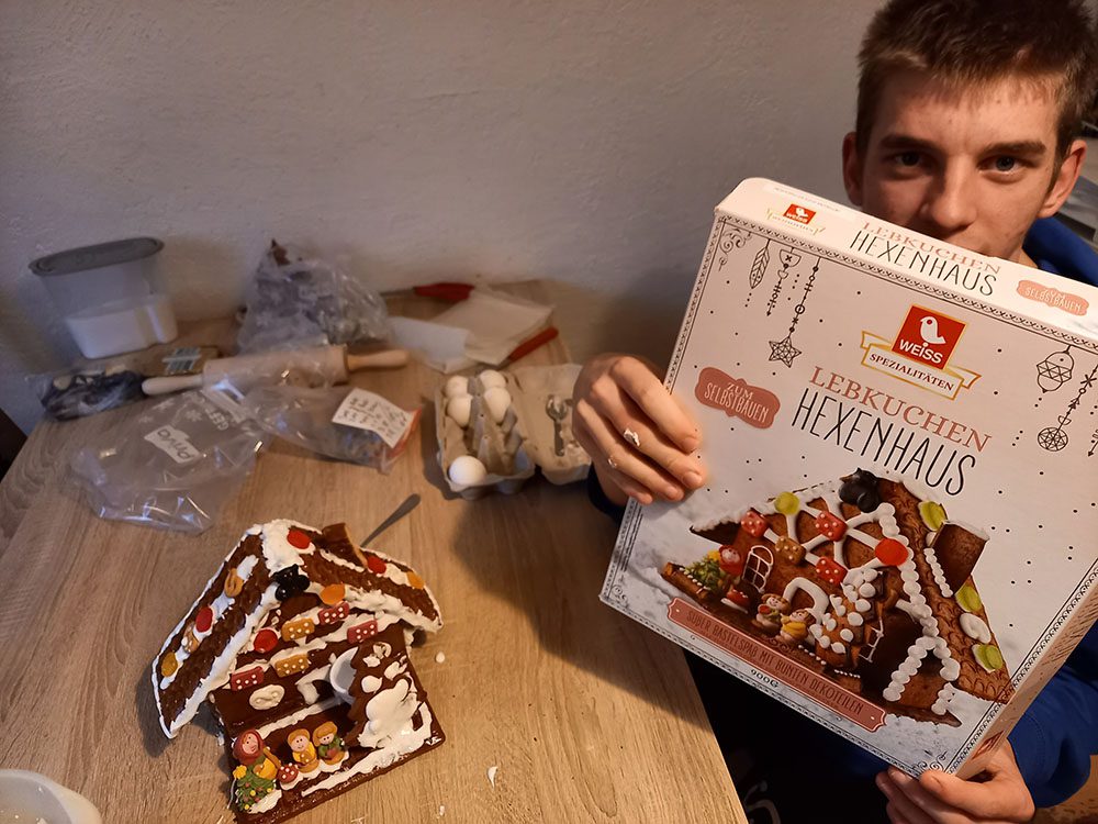 Gemeinsames Plätzchenbacken mit einer SPFH-Familie. Der Weihnachtsmann brachte im Auftrag des Vereins „Freiberg zeigt Herz“ ein Pfefferkuchenhaus, welches natürlich sofort aufgebaut wurde. Die Freude war bei allen war groß – eine gelungene Überraschung!