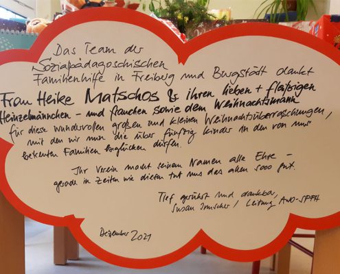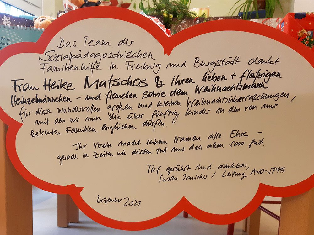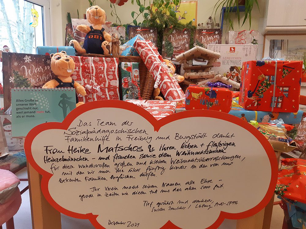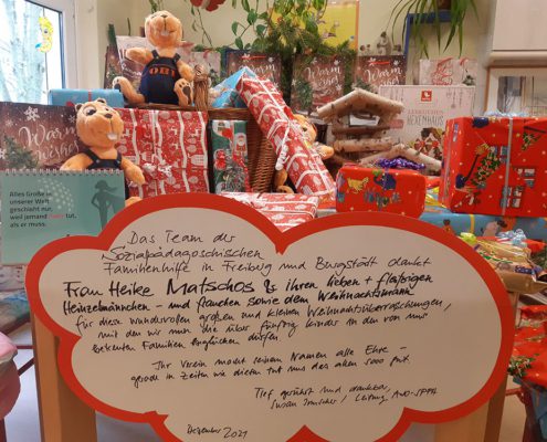 Das Team der Sozialpädagogischen Familienhilfe in Freiberg und Burgstädt war sichtlich gerührt und bedankt sich bei der Vereinsvorsitzenden Frau Heike Matschos und ihren lieben fleißigen Heinzelmännchen- und frauchen sowie dem Weihnachtsmann für die vielen Geschenke, mit denen wir über 50 Kinder in den von uns betreuten Familien eine Freude bereiten können.