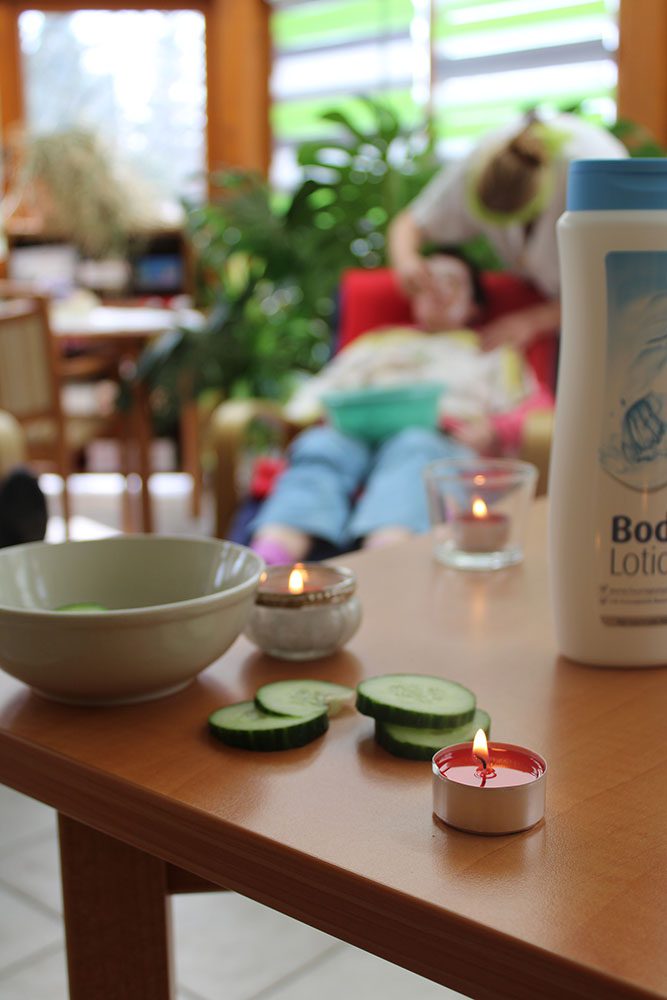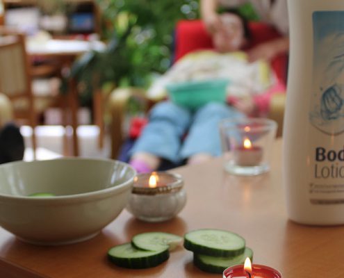 Es ist kuschlig warm im lichtdurchfluteten Wintergarten der Tagespflege im Forstweg. Entspannungsmusik und der Duft von Kerzen und Ölen luden unsere Gäste letzte Woche ein, um in unsere Wellness-Oase einzutauchen.