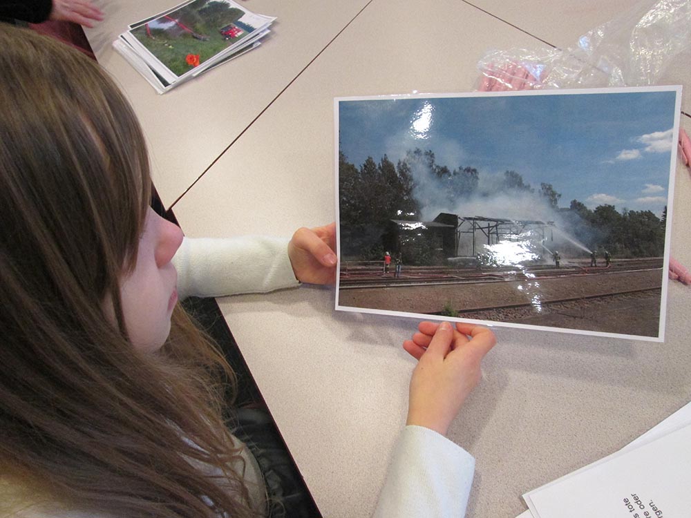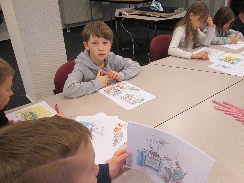 Die Kinder sollten herausfinden, wo die Fehler im Umgang mti einem Bügeleisen liegen – Kann man es auf einem Kleidungsstück stehen lassen? Was ist mit dem Kabel?